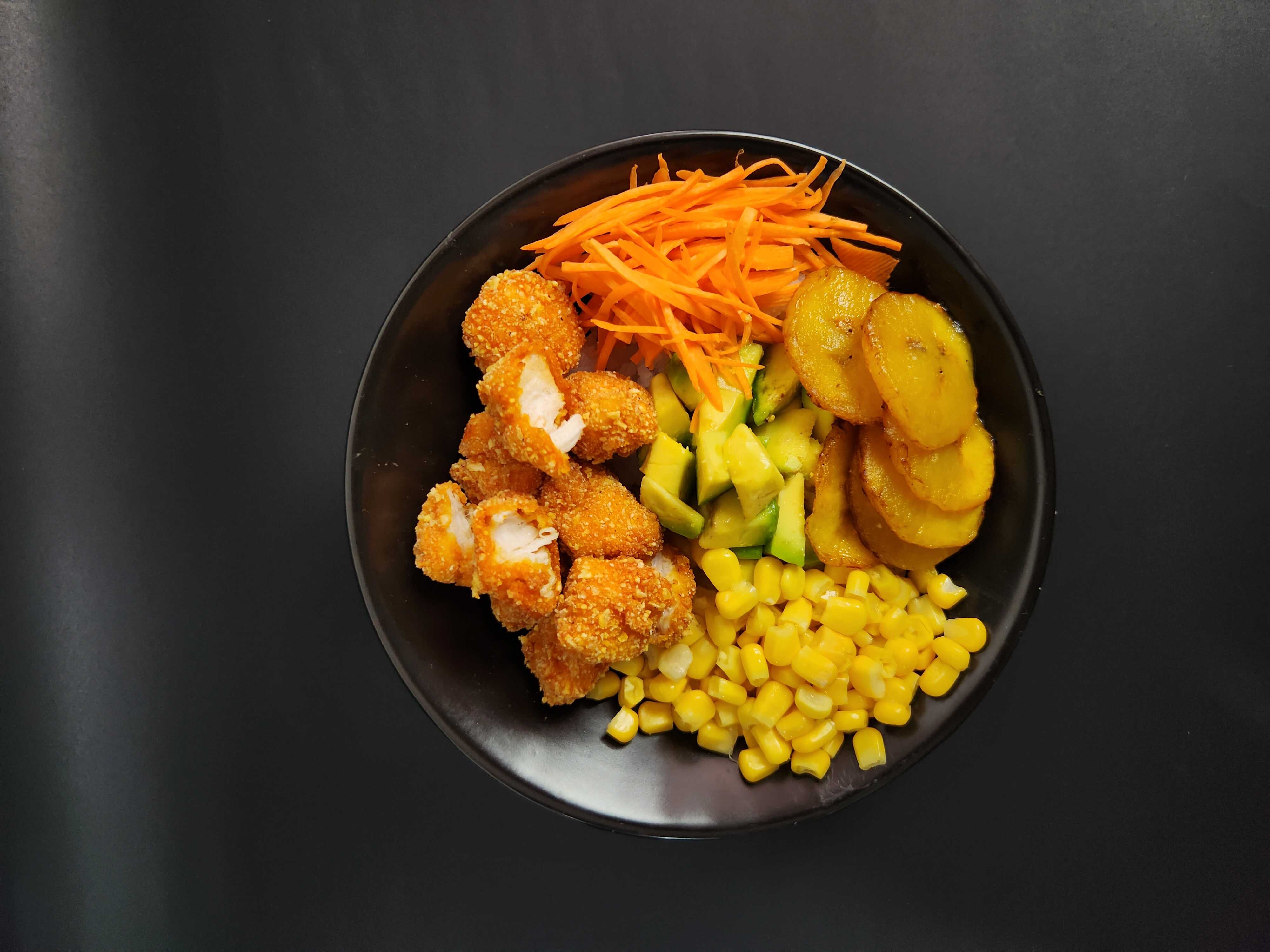 Arroz de Sushi, Pollo Apanado, maíz, maduritos, aguacate zanahoria o salsa chipotle