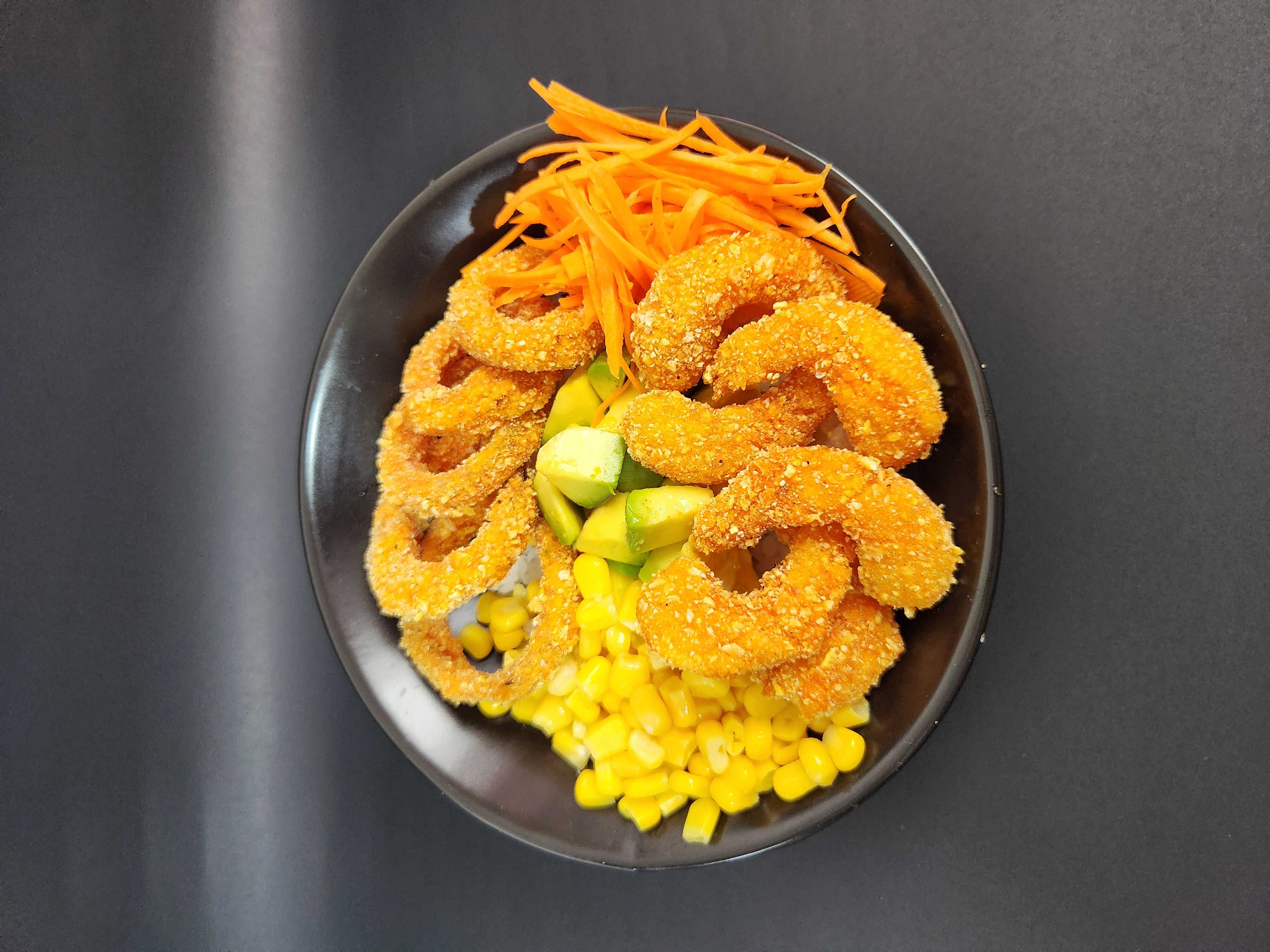 Arroz de Sushi, Camarones Apanados, maiz, Cebolla crispy, aguacate y zanahoria