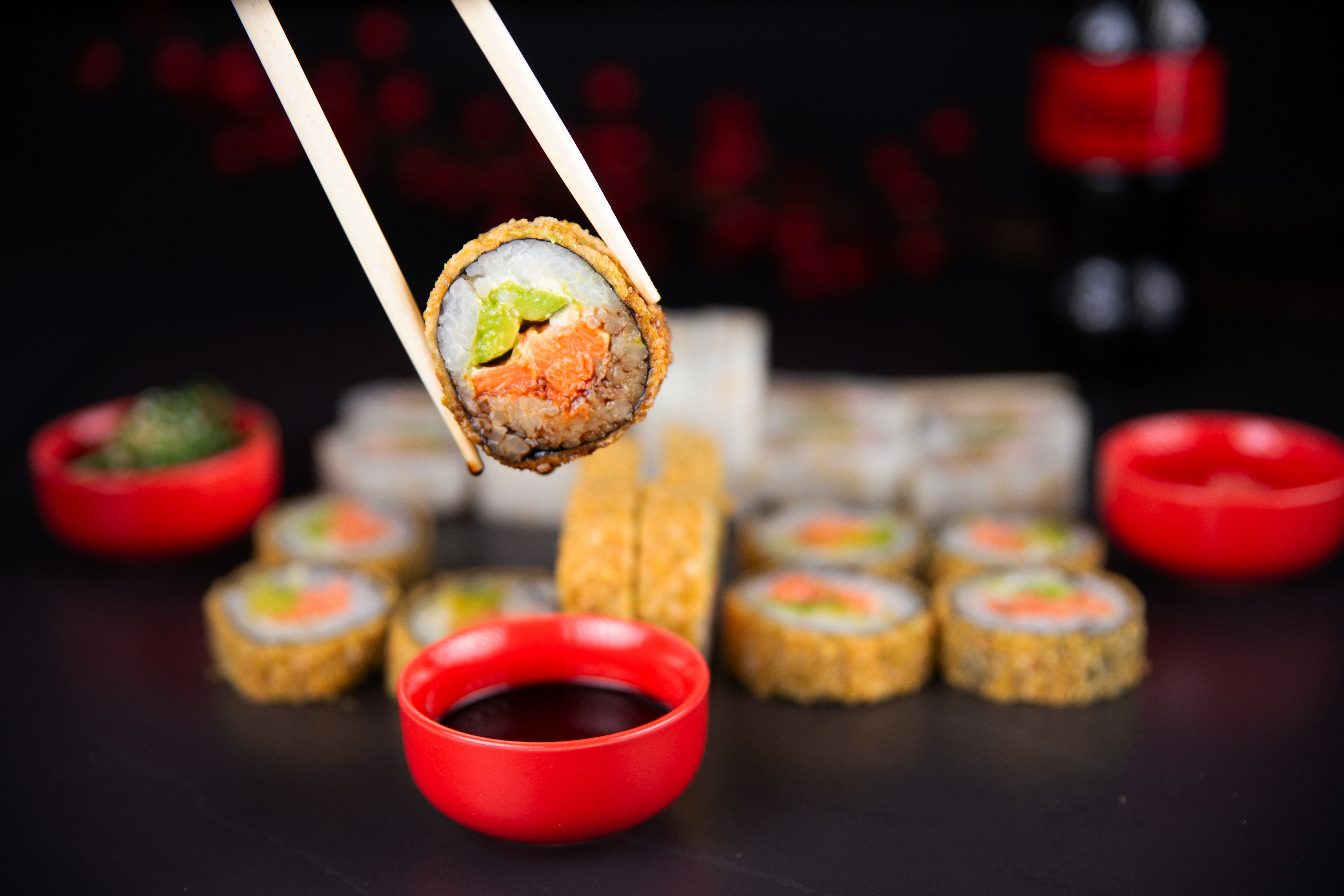Roll Pasta de palmito en tempura, plátano maduro, toping de aguacate.