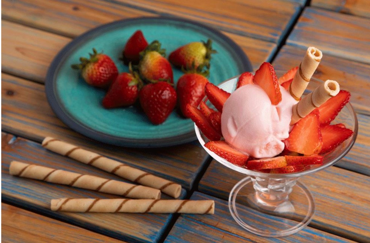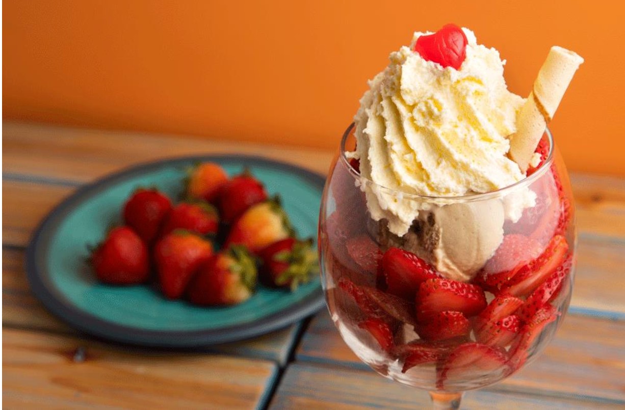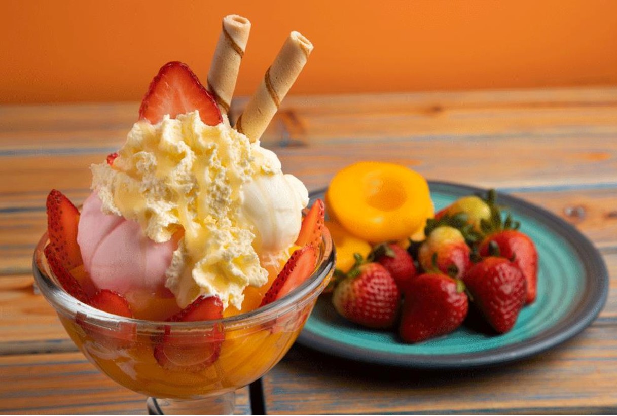 Un dulce durazno, con trozos de fresa y leche condensada combinados con helado de fresa y de vainilla, enriquecido con chantilly y doble barquillo.