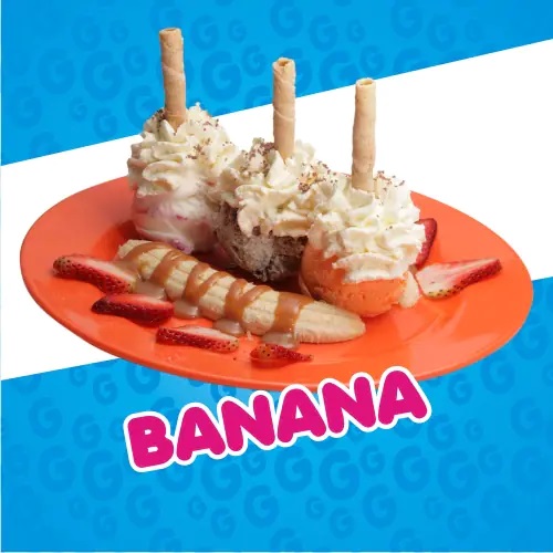 Doble porción de helado de arequipe, con porción de vainilla, la fabulosa combinación de rodajas de banano con fresas y bañado en salsa de arequipe, decorado con chantilly, cereza y barquillo.