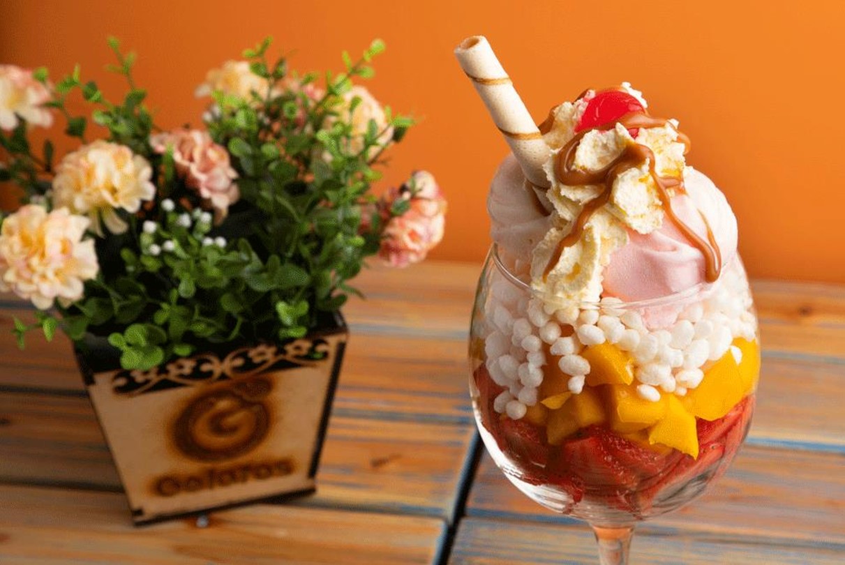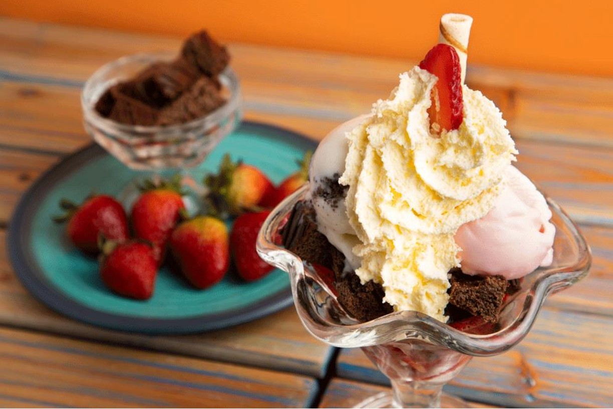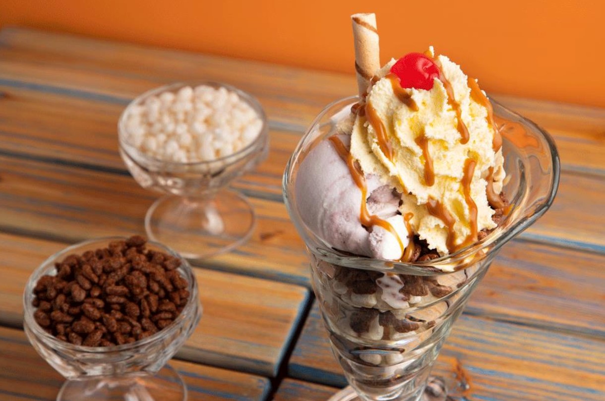 Sabrosa mezcla de doble helado de mandarina, fresa y vainilla con crispi blanco,con trozos de mango y fresa, salsa de arequipe y nuestro chantilly con cereza.