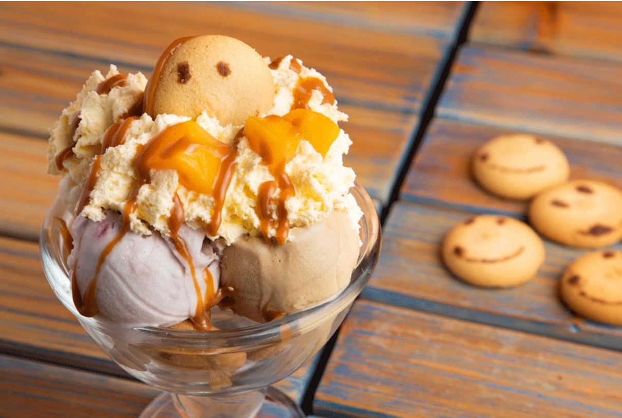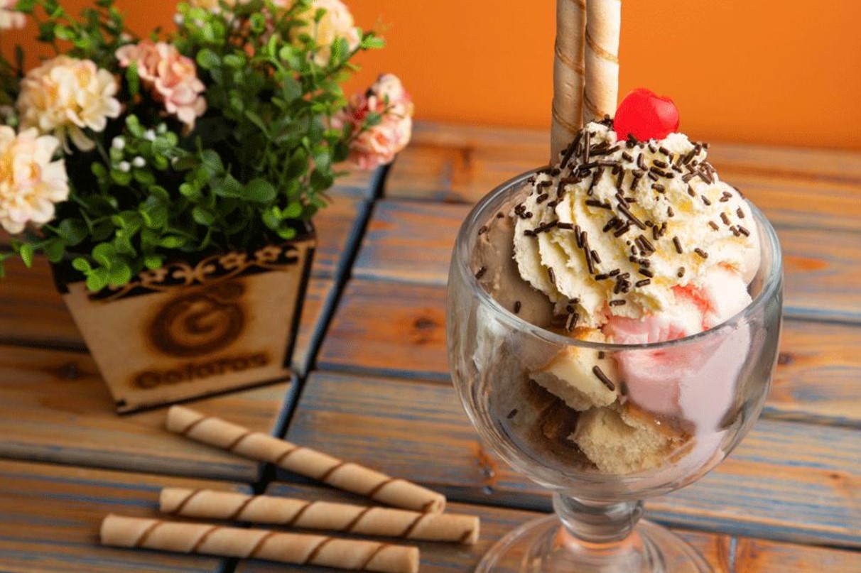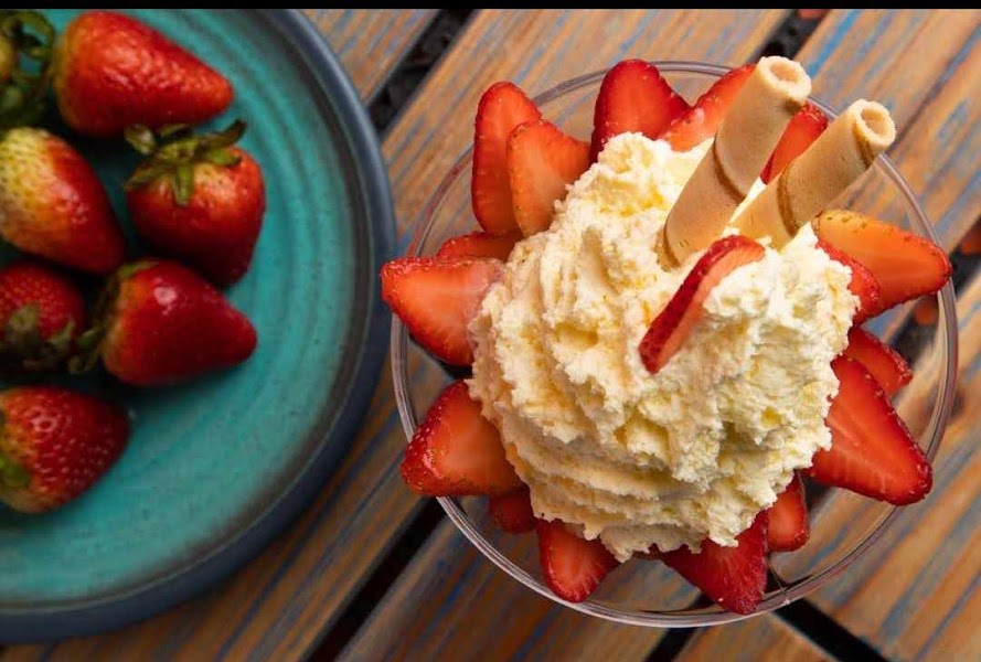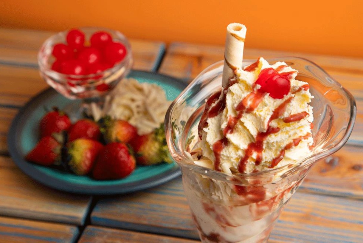 Sabrosa mezcla de doble helado de mandarina, fresa y vainilla con crispi blanco,con trozos de mango y fresa, salsa de arequipe y nuestro chantilly con cereza.