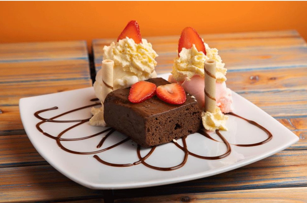 Delicioso brownie con helado de vainilla y fresa aemas de la decoración con nuestra rica crema chantilly y fresas.