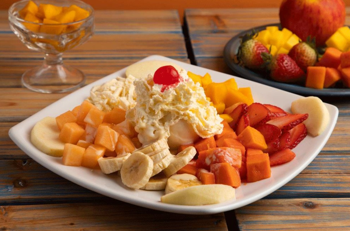 Combinación de las más ricas frutas, mango, manzana, melón, papaya, banana y fresas acompañando con helado de vainilla y enriquecida con chantilly, cereza y salsa de arequipe.