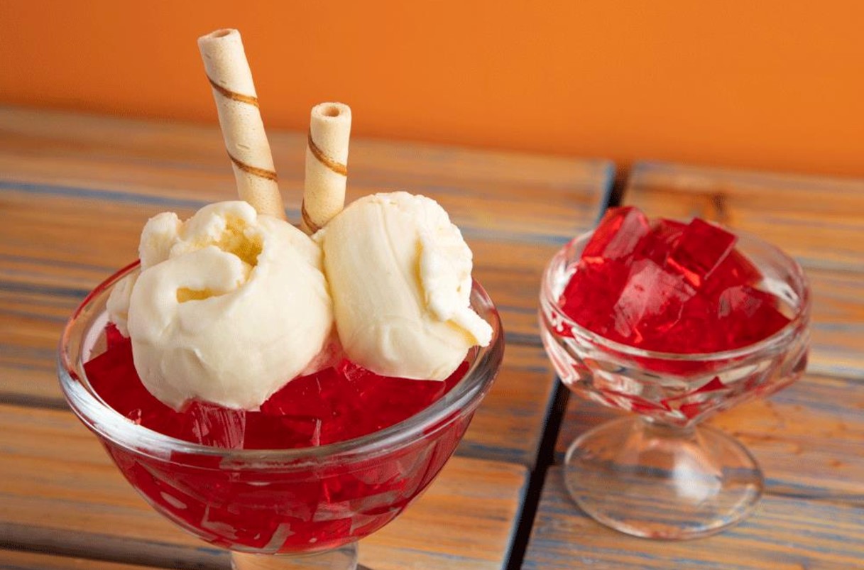 Exquisita gelatina de fresa bañada en lechera, doble helado de vainilla, con salsa de arequipe y barquillo.