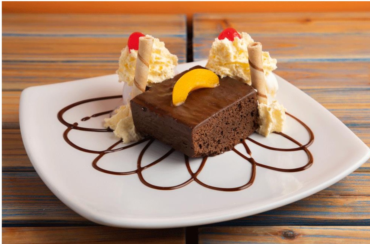 Exquisito brownie caliente, acompañado de helado de brownie y veteado de mora, endulzado con chantilly, cereza y un toque delicado de duraznos y doble barquillo.