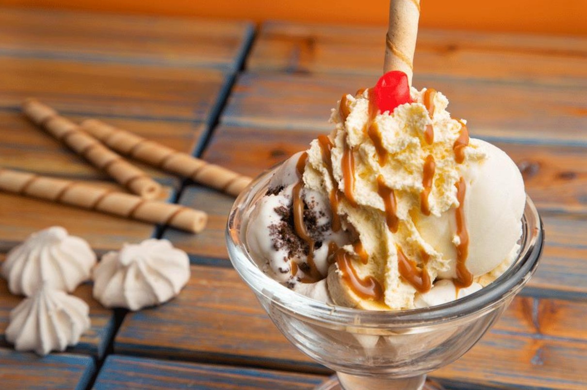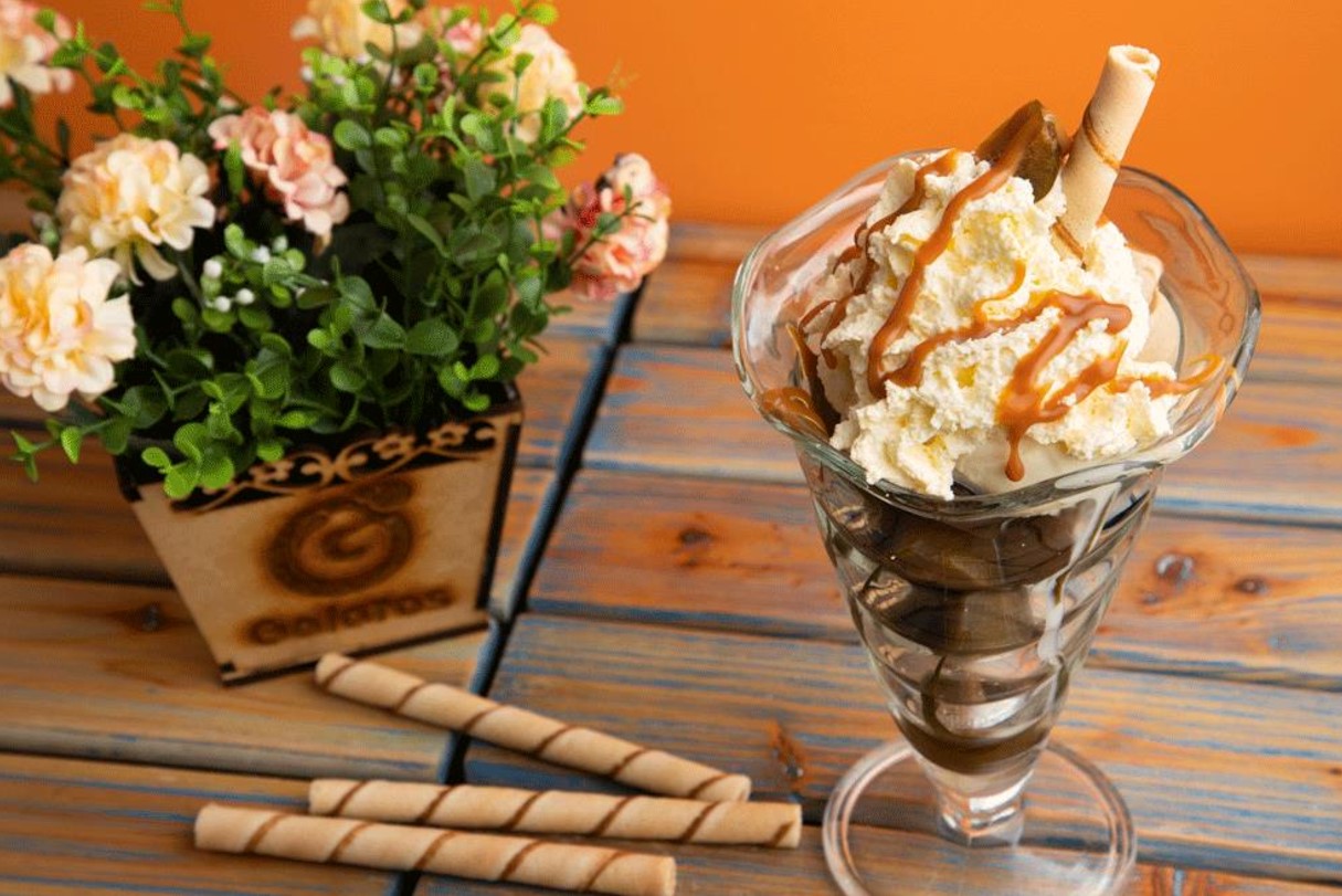 Apetitosa combinación de queso con doble porción de helado de vainilla, chantilly y barquillo, bañada con una deliciosa salsa artesanal.