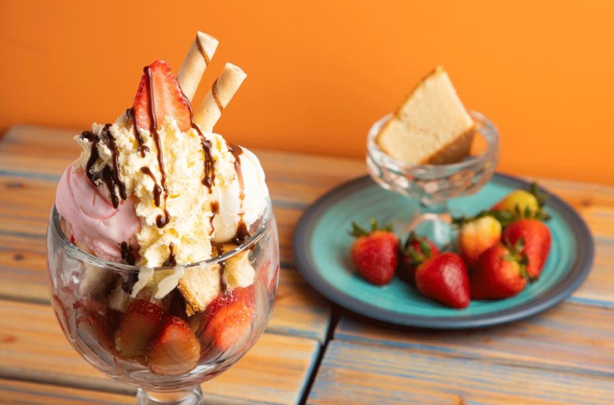 Un gustoso y doble helado de fresa, helado de vainilla y helado de arequipe con trozos de fresa, bañados en con leche condensada, chantilly, cereza y barquillo.