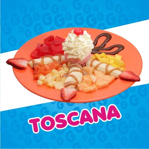 Refrescante gelatina de fresa, combinada con fresas en trocitos, doble porción de helado de fresa y porción de vainilla, engalanada con chantilly, leche condensada fresas y doble barquillo.
