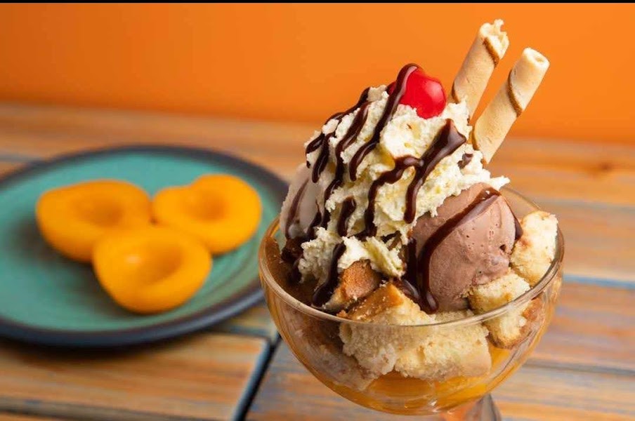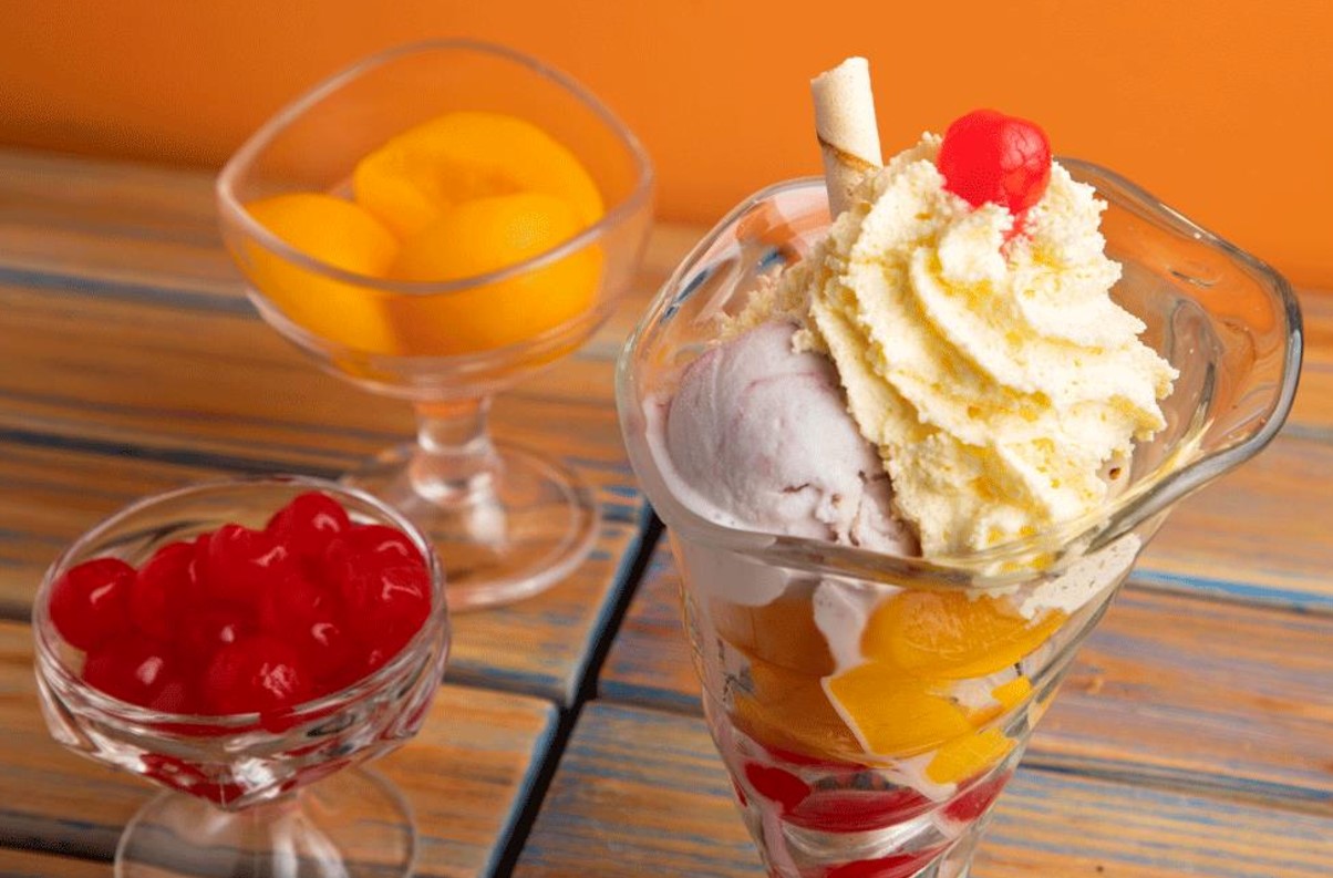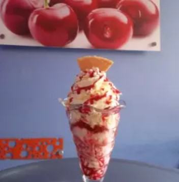 Apetitosos duraznos,acompañados de cerezas, con helado de mora, arequipe y vainilla, enriquecidos con chantilly, cereza y leche condensada.