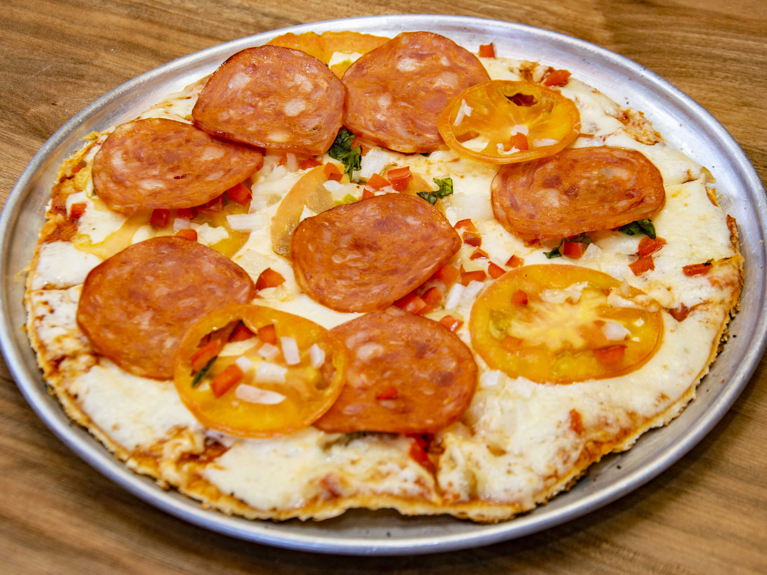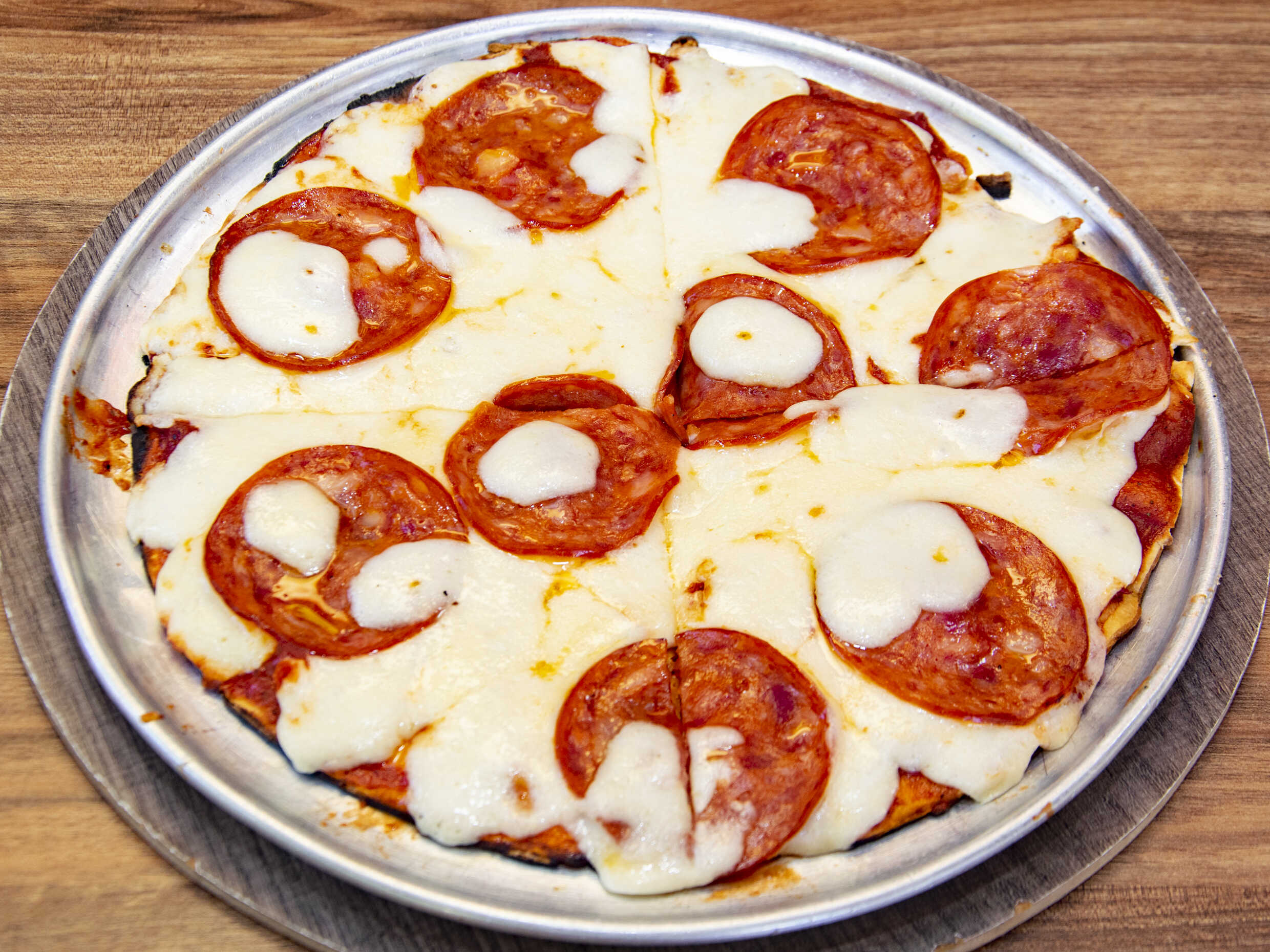 rica pizza 4 porciones de peperoni, cabano, pimenton, albahaca y tomate picado