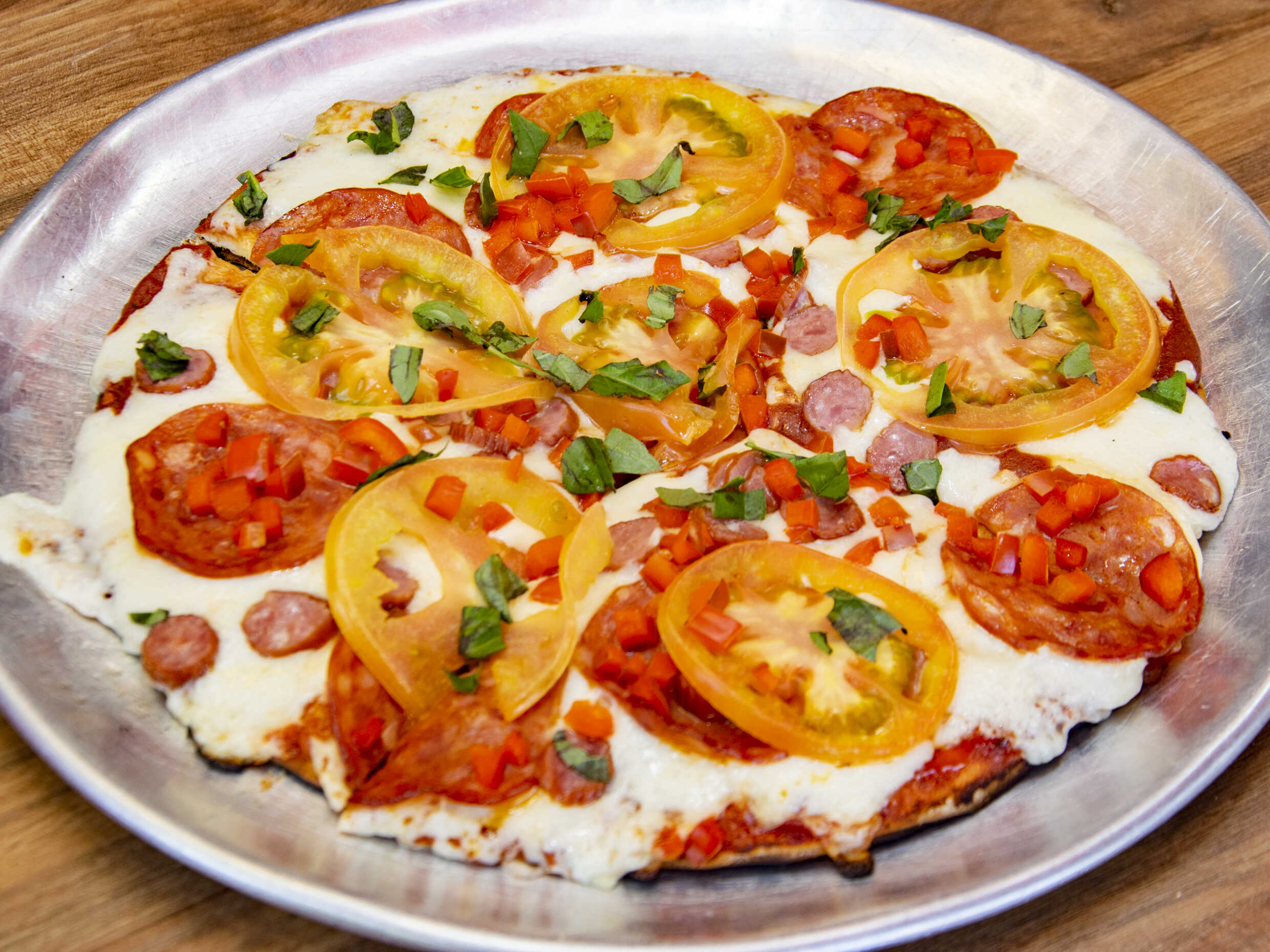 Pizza de 4 porciones. Ingredientes: tomate en rodajas y orégano.