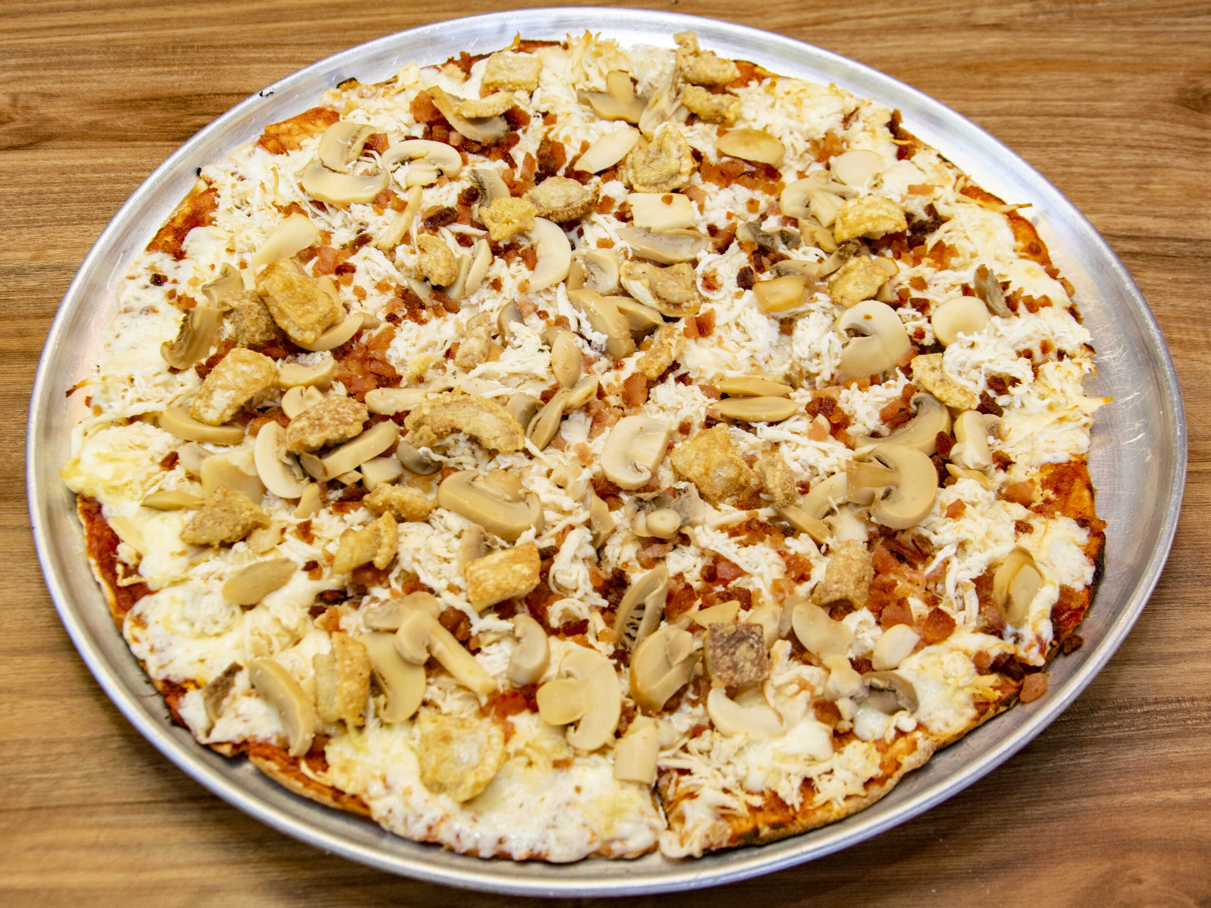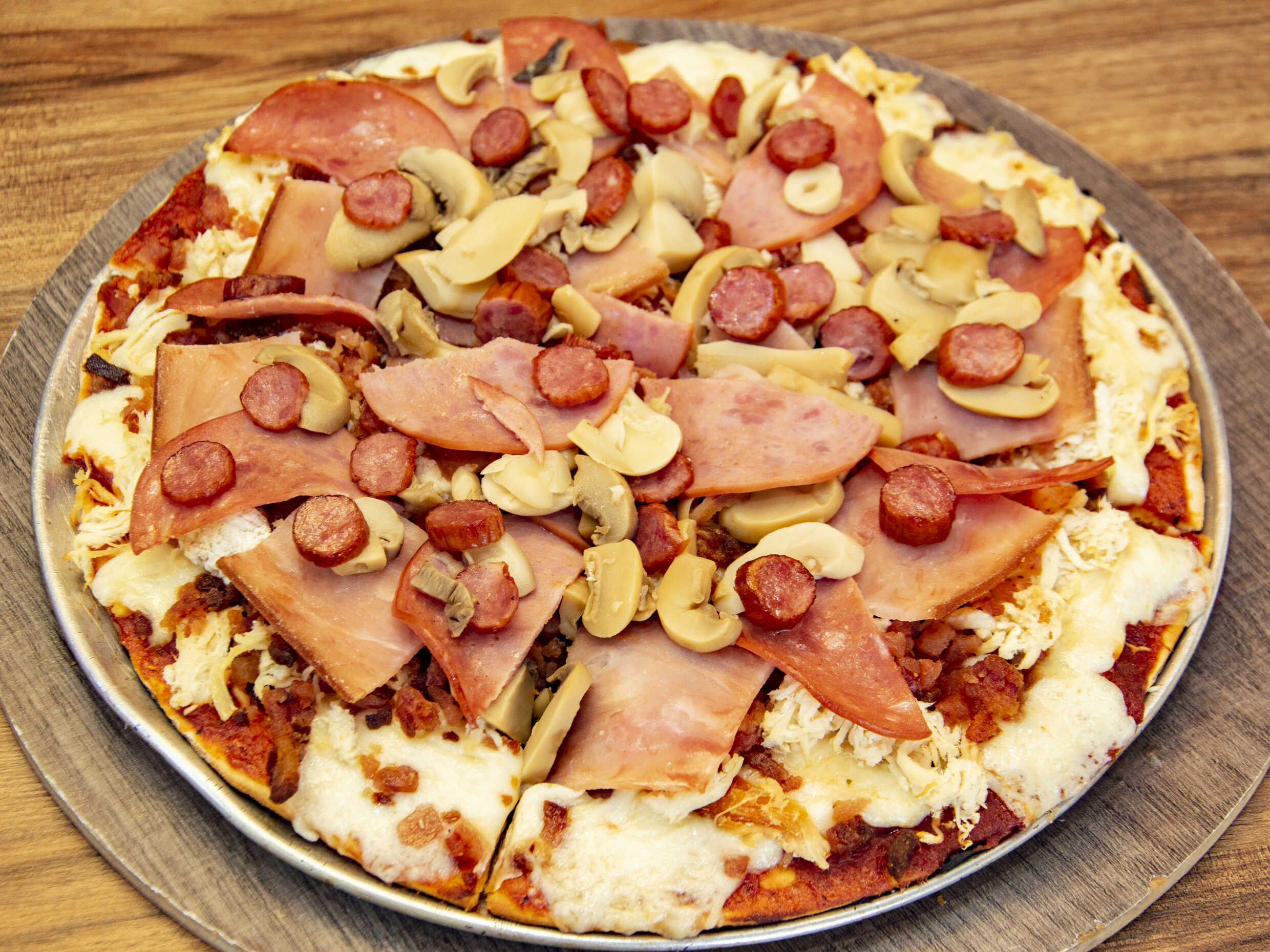 Rica pizza tamaño familiar de 12 porciones de jamon, salami, cabano, pollo champiñones y tocineta