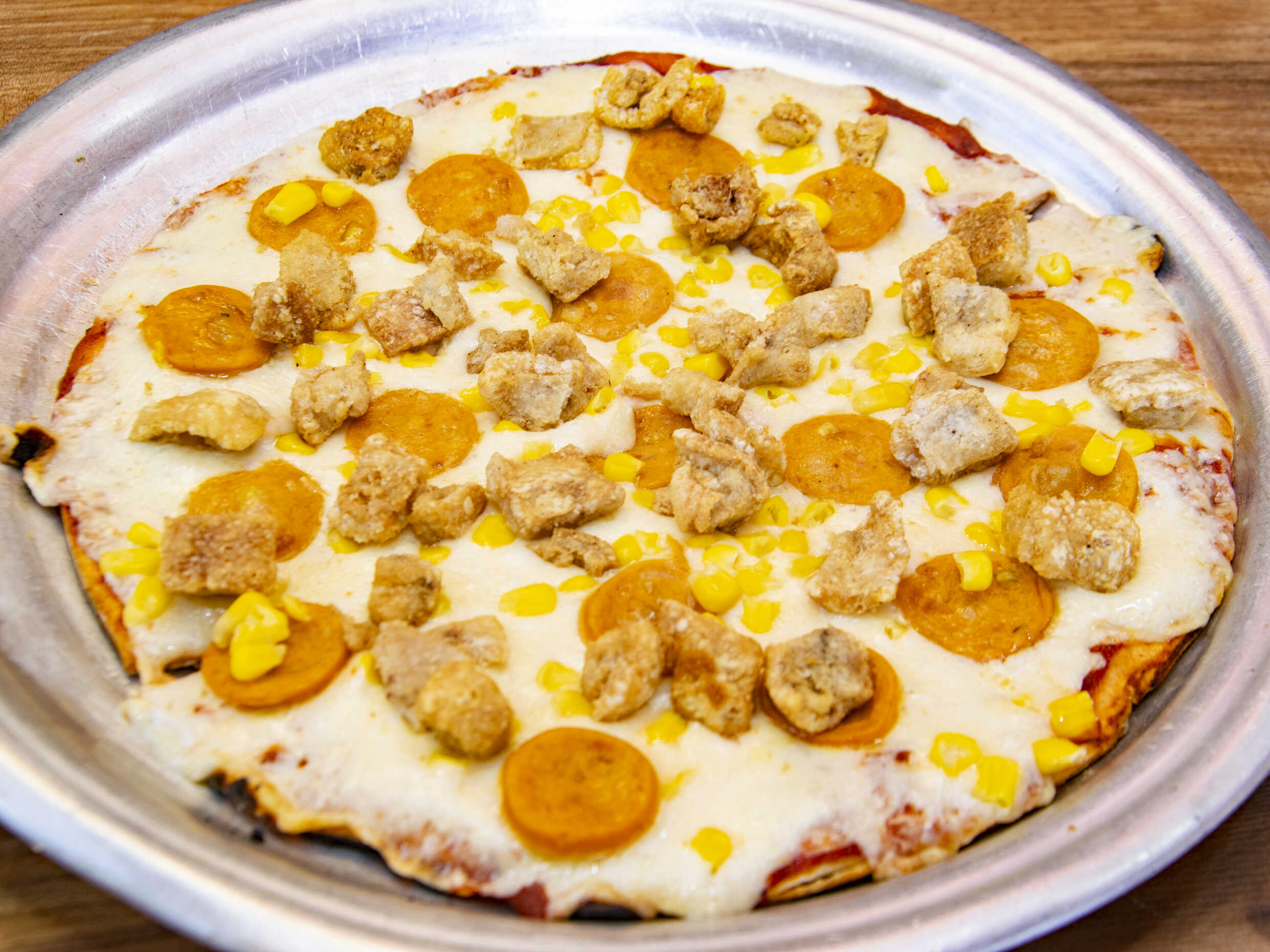 rica pizza pequeña de 4 porciones de chorizo, chicharron y maicitos