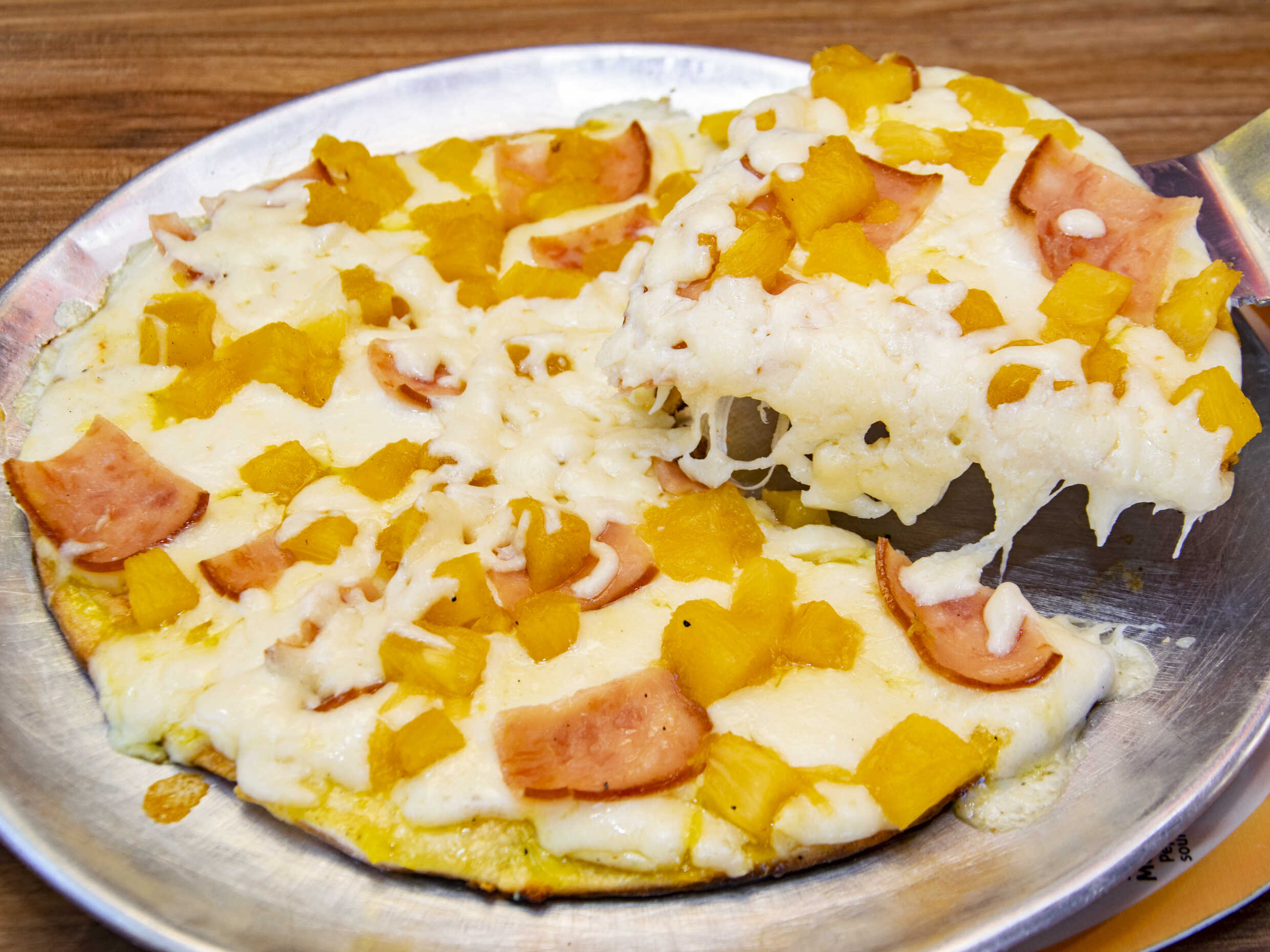 rica pizza 4 porciones de jamon, piña, tocineta, maiz