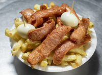 Plato pequeño con papas a la francesas, 1 salchicha, 4 chorizos cócteleros.