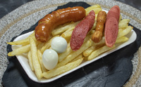 Papas, 3 salchichas, 1 chorizo cóctel, 2 huevos.