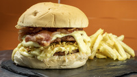 Carne de hamburguesa, queso, ensalada, tocineta, ripio de papa.