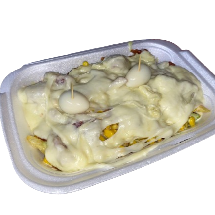 Papas, queso, maicitos, tocineta, 2 huevos.