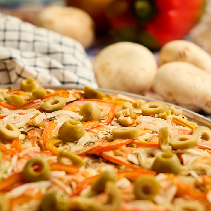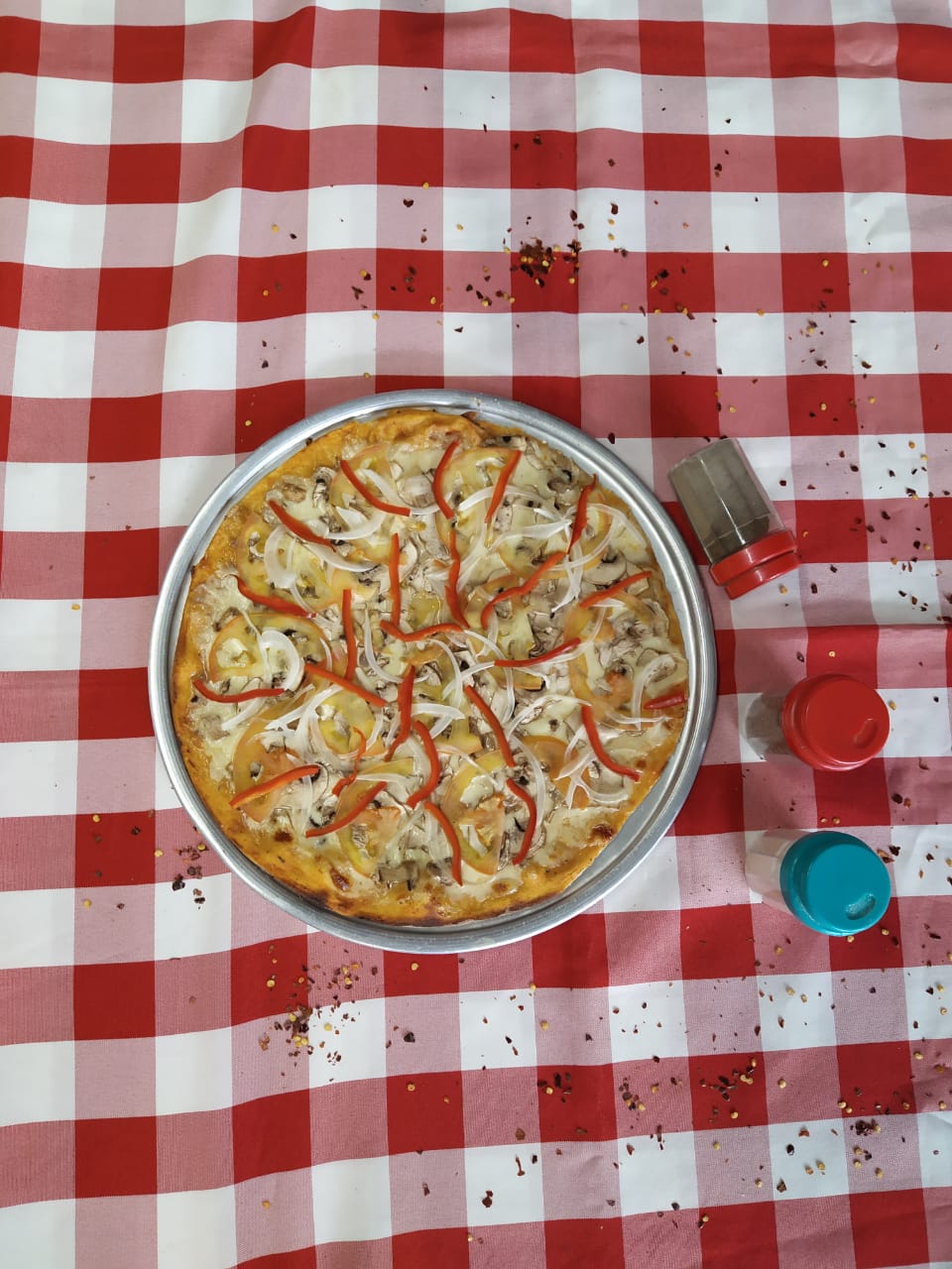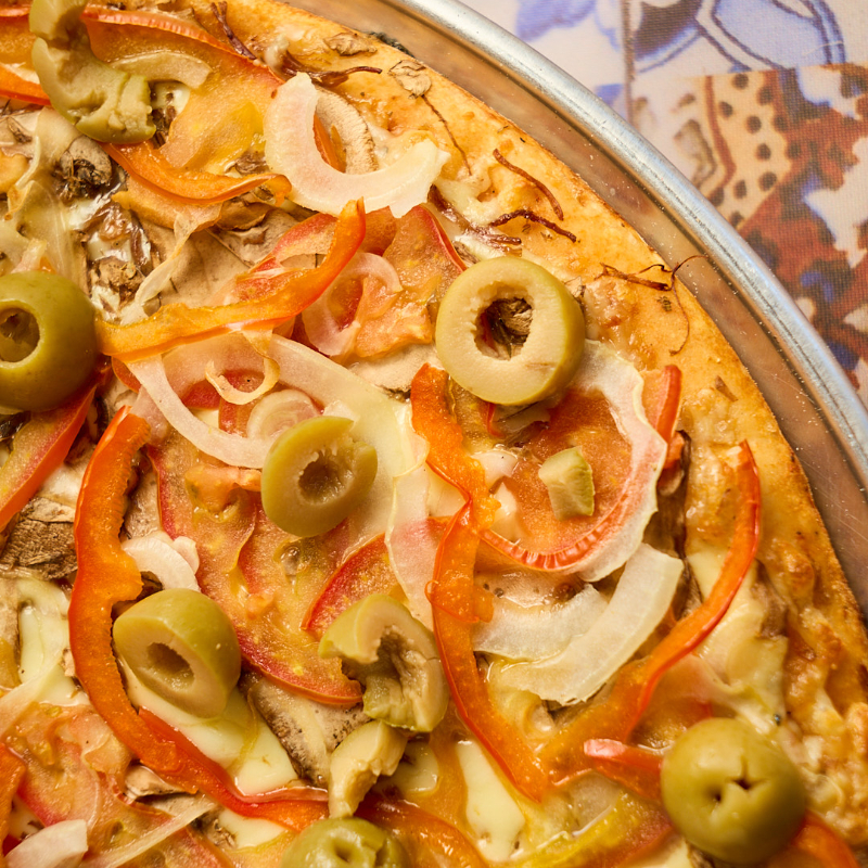 Tomate, cebolla, champiñones, pimentón, aceitunas.