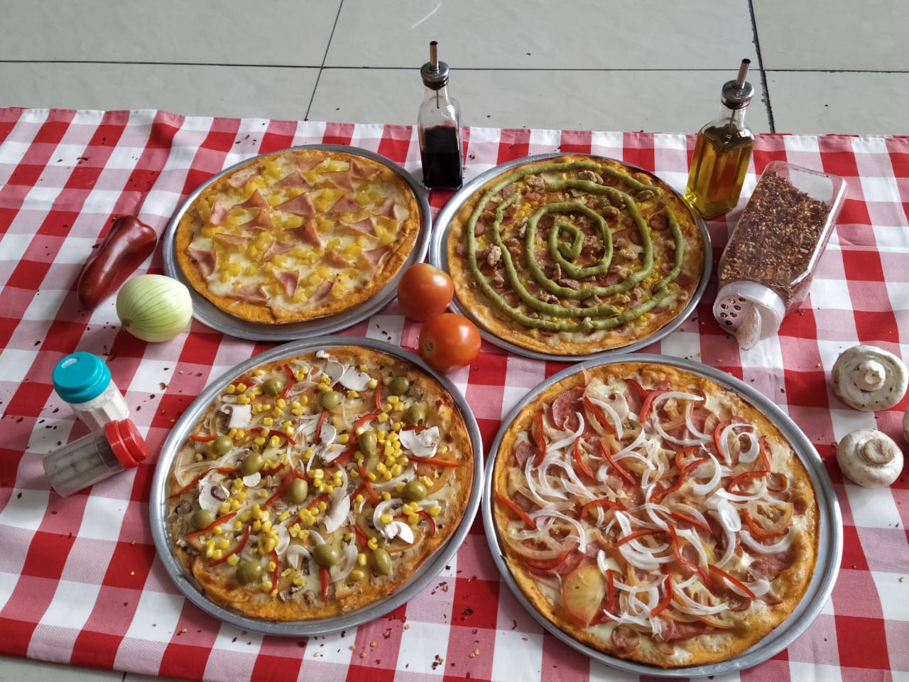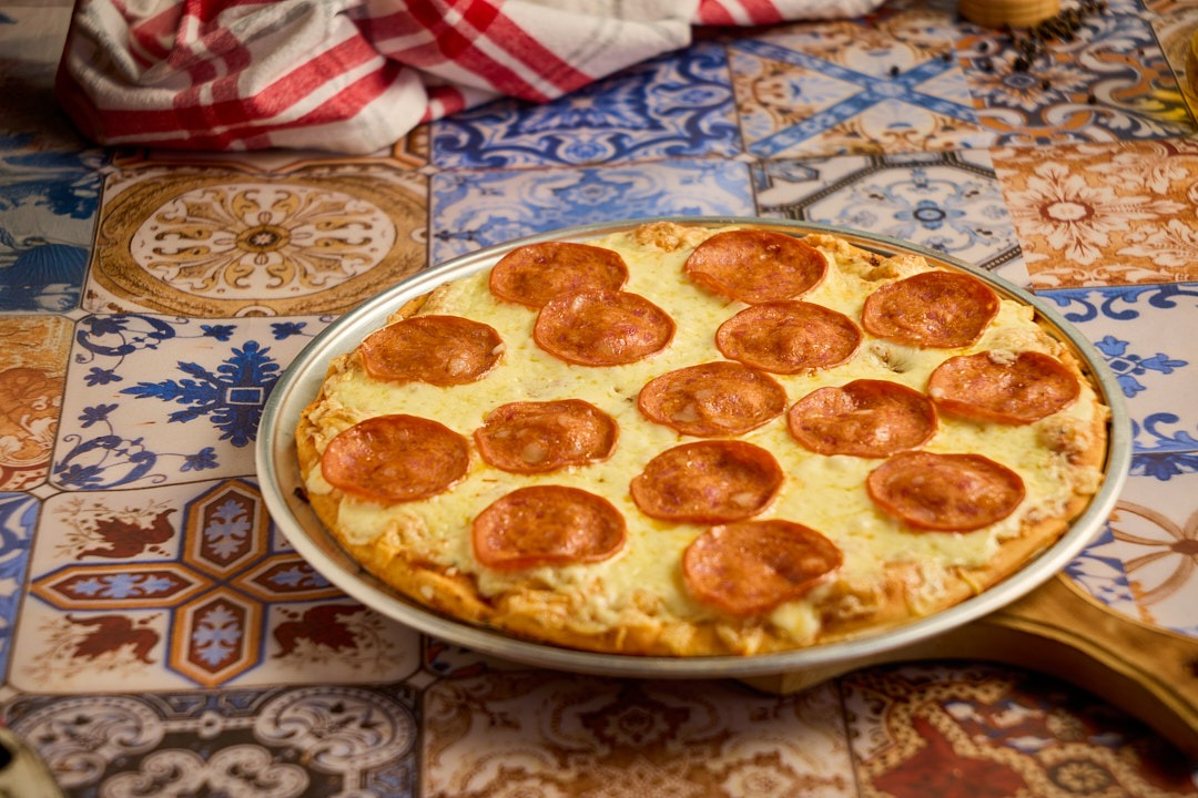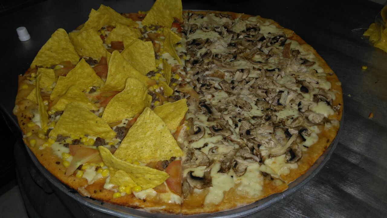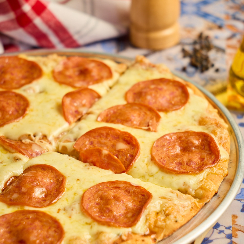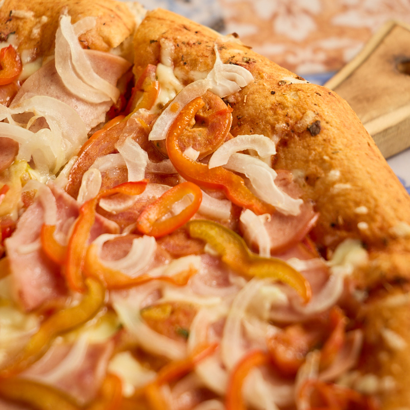 Jamón, salami, ranchera, chorizo, pepperoni, tomate, cebolla, pimentón.