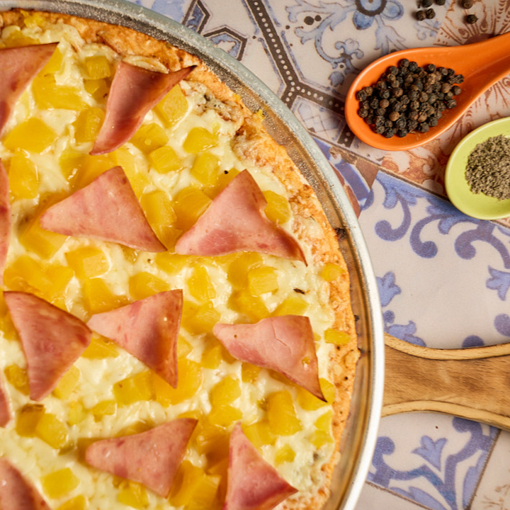 Deliciosa Pizza Hawaiana de 12 Porciones hecha con masa artesanal