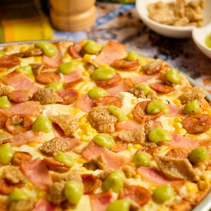 Maíz, chorizo, tocineta, guacamole, chicharrón.