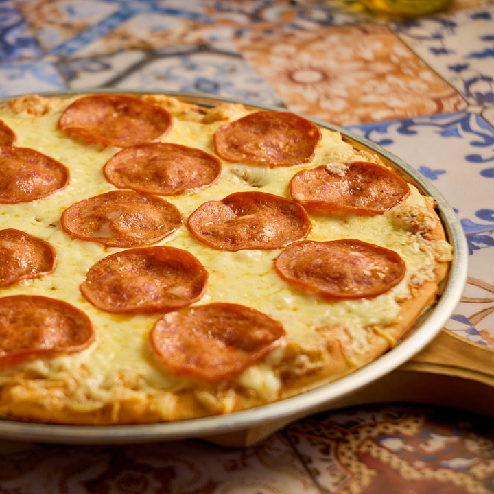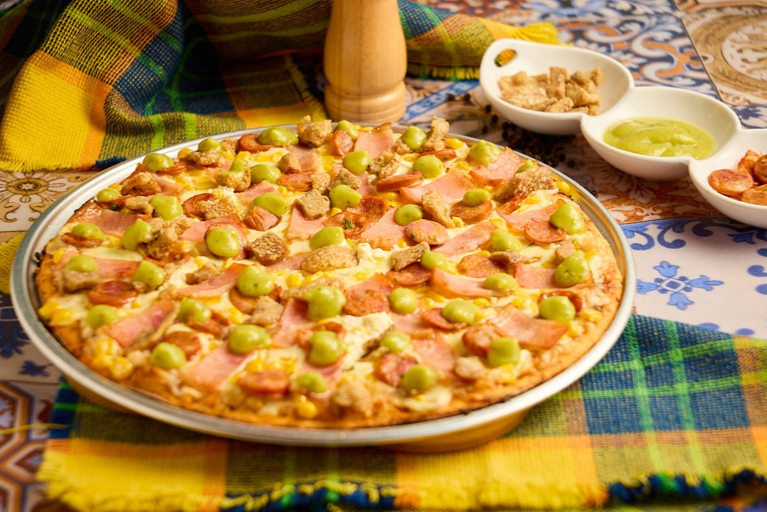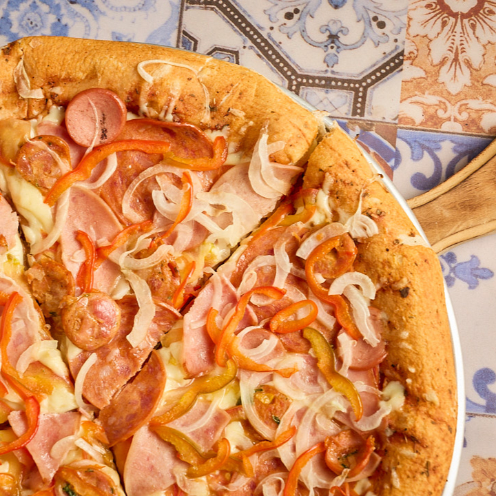 Jamón, salami, ranchera, chorizo, pepperoni, tomate, cebolla y pimentón.