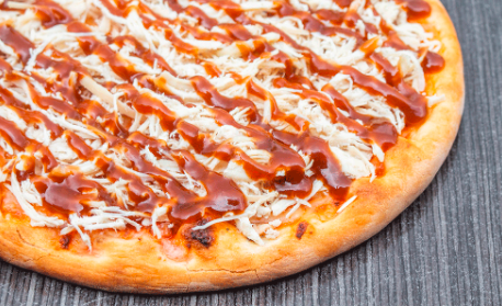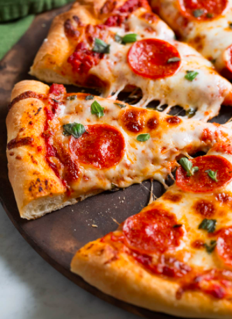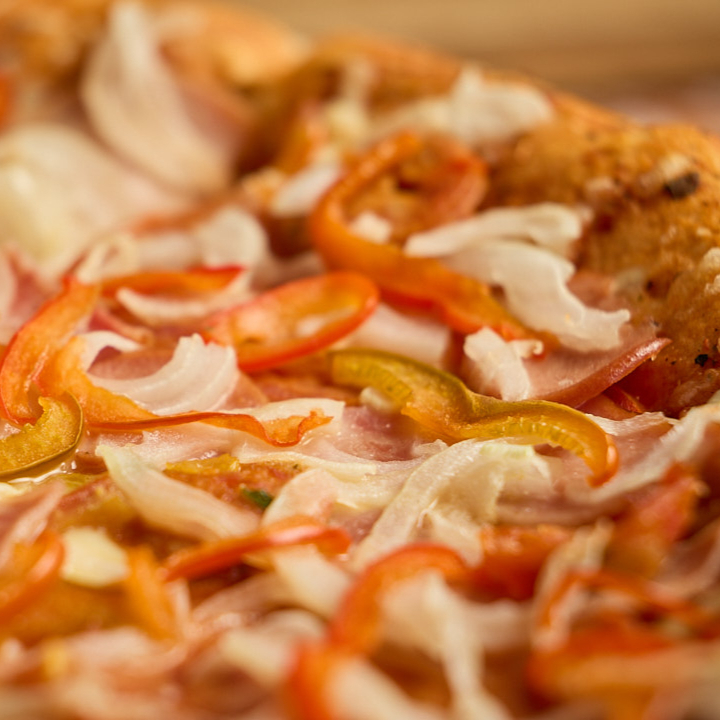Deliciosa pizza jamón & queso de 12 de porciones hecha con masa artesanal.