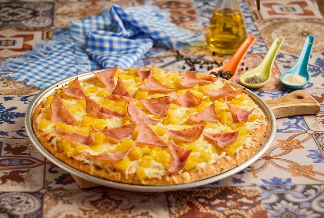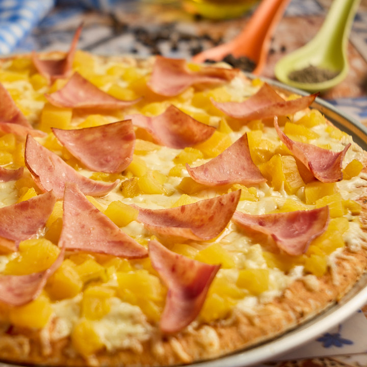 Deliciosa pizza hawaiana de 12 de porciones hecha con masa artesanal.