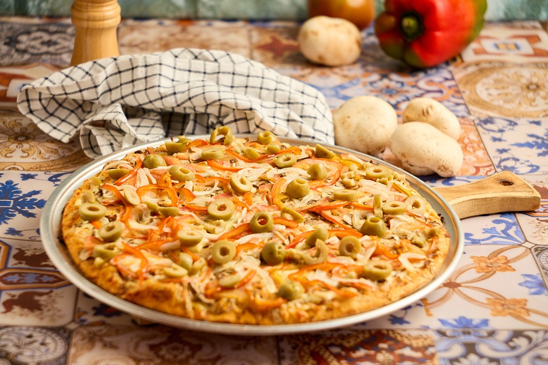 Tomate, cebolla, champiñones, pimentón y aceitunas.