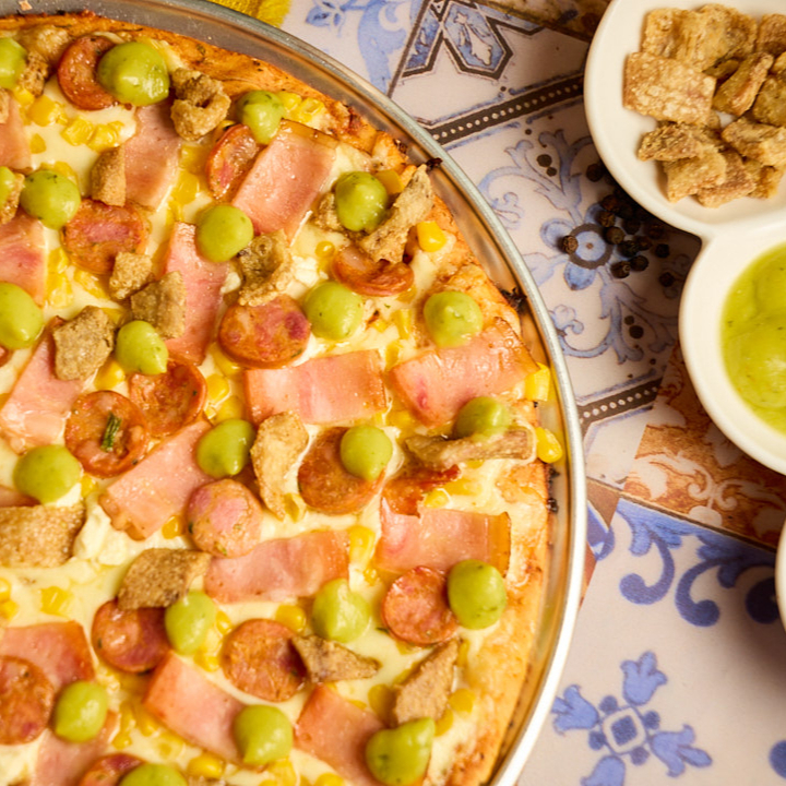 Maíz, chorizo, tocineta, guacamole y chicharrón.
