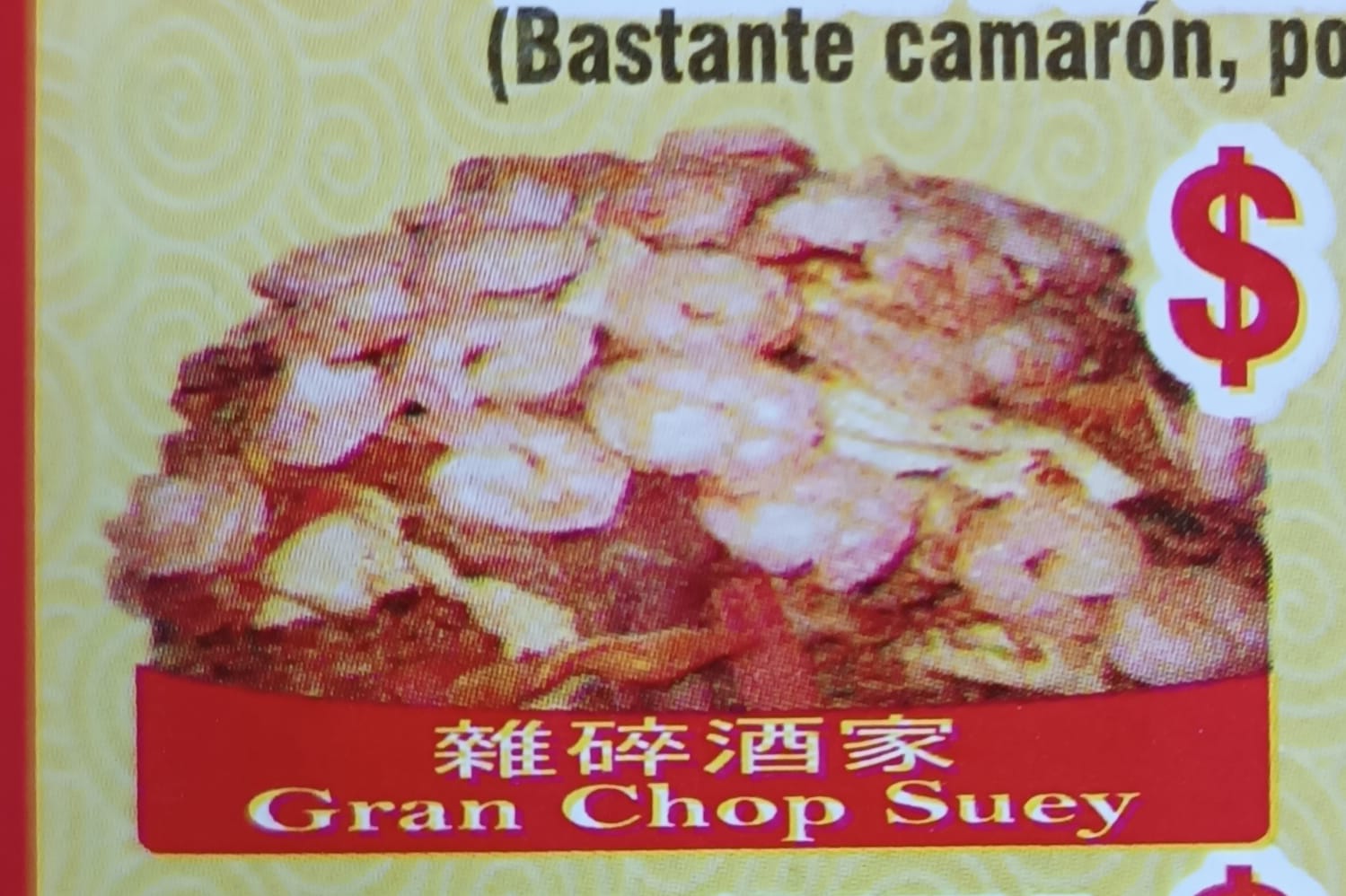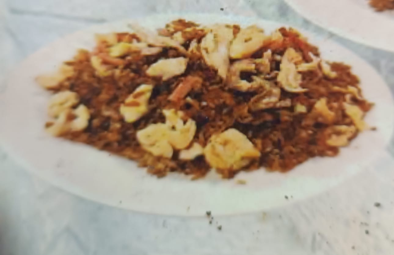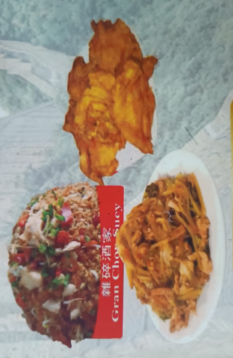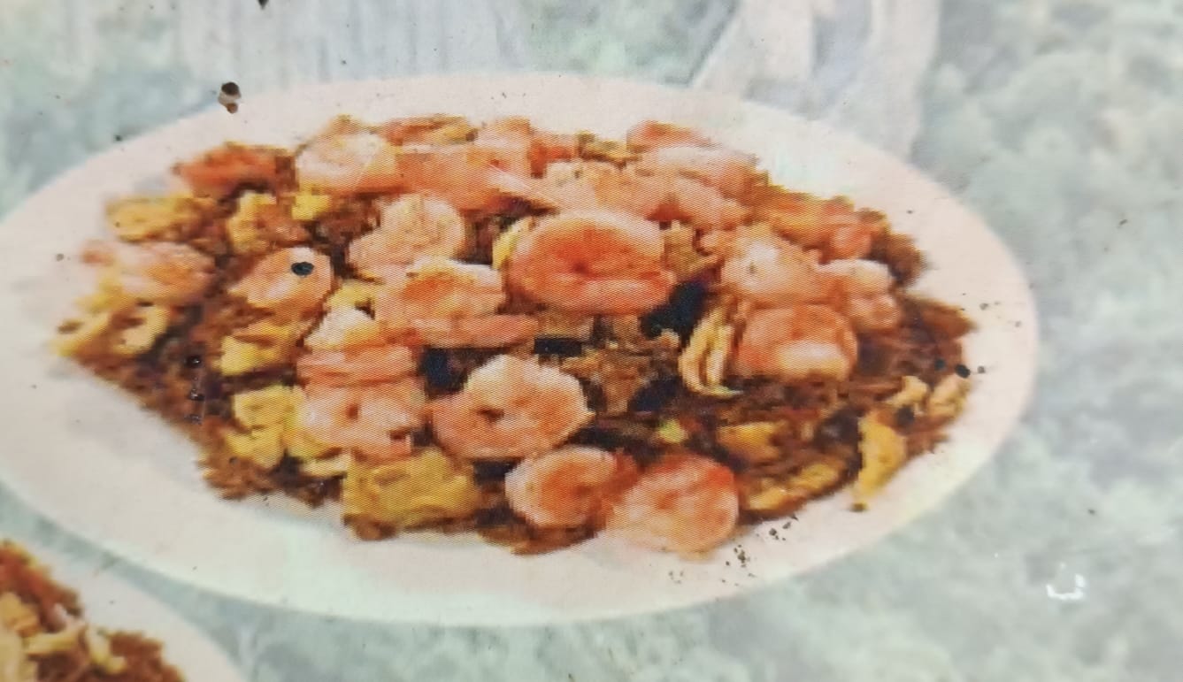 arroz especies, camarones, pollo cerdo y jamon