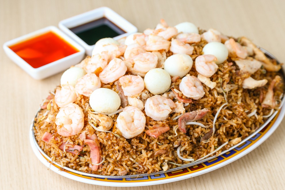 Arroz chino super especial + Pollo picado + cerdo picado + camarones + huevo de codorniz
