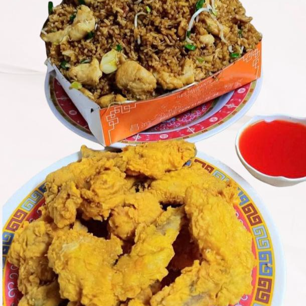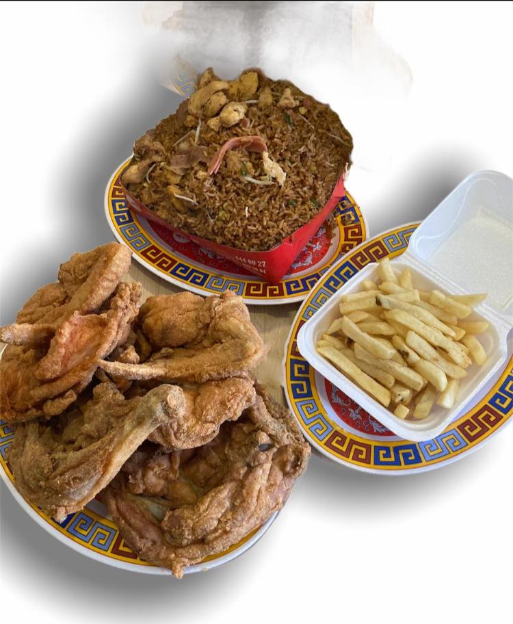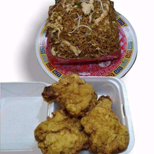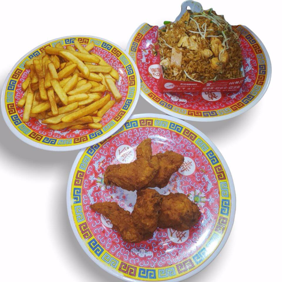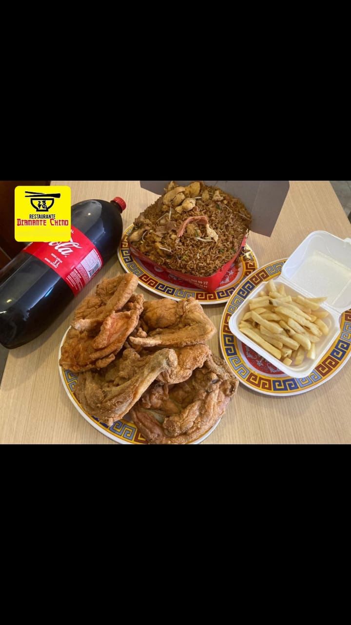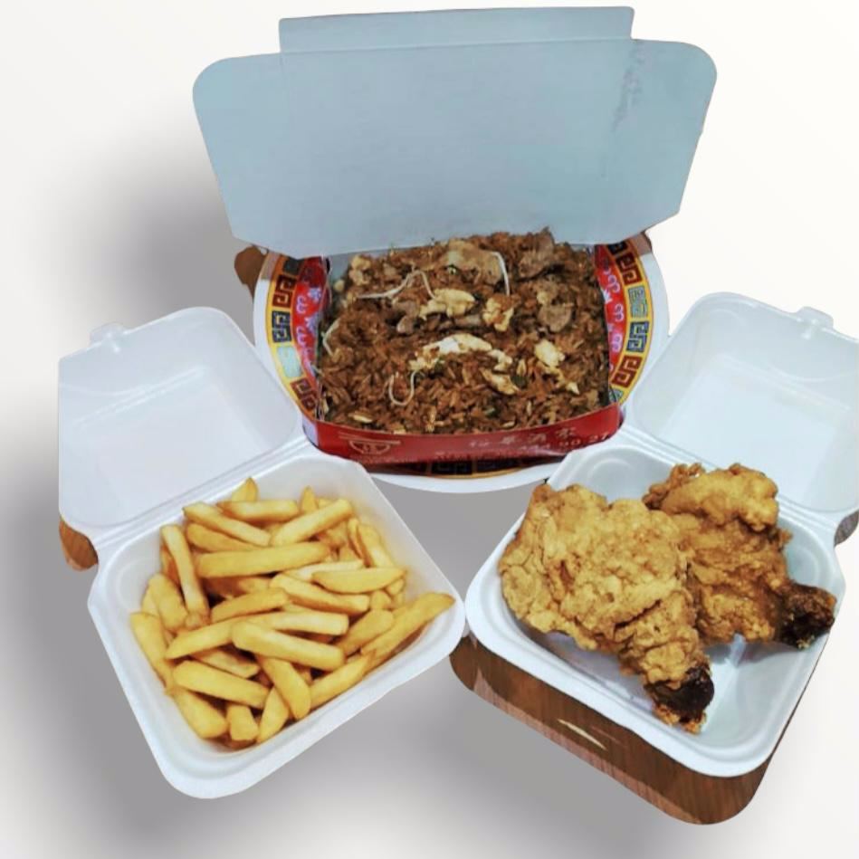 Caja grande de Arroz + 20 piezas de Alas Ó 10 Muslos de pollo + Papas a la francesa + Chopsuey + Gaseosa Mega 3L