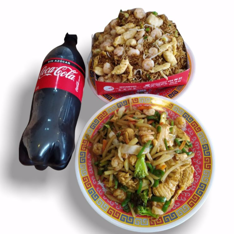 Caja grande de Arroz con pollo picado + Camarones & Chopsuey con pollo picado + Camarones + Gaseosa 1.5ML