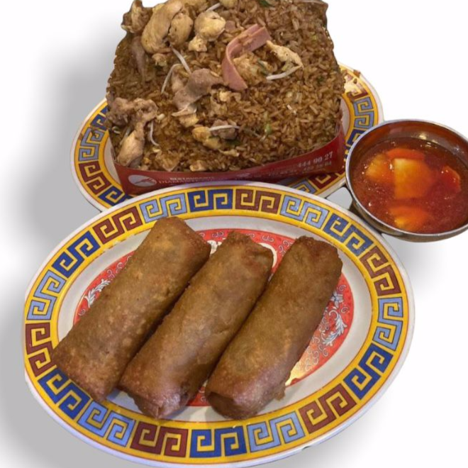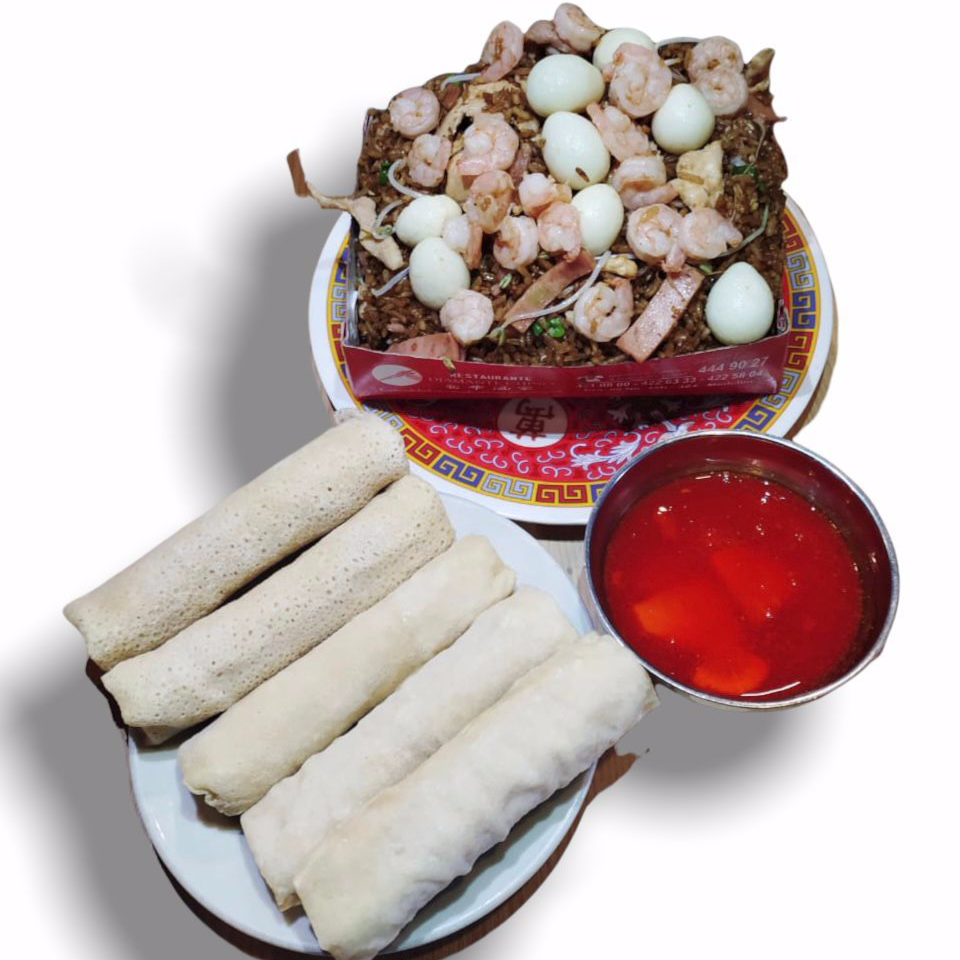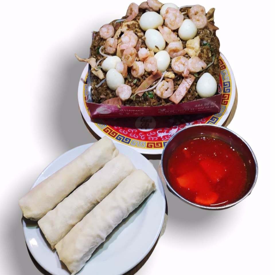Caja mediana de Arroz Super especial + 3 Lumpias de Queso y bocadillo (3 Personas)