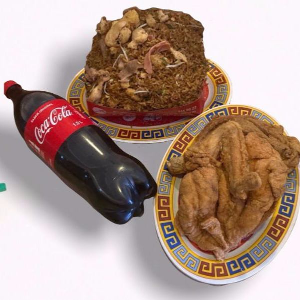 Caja grande de arroz + 1/2 Pollo + Gaseosa 1.5 ML (Puedes cambiar la gaseosa por las papas)