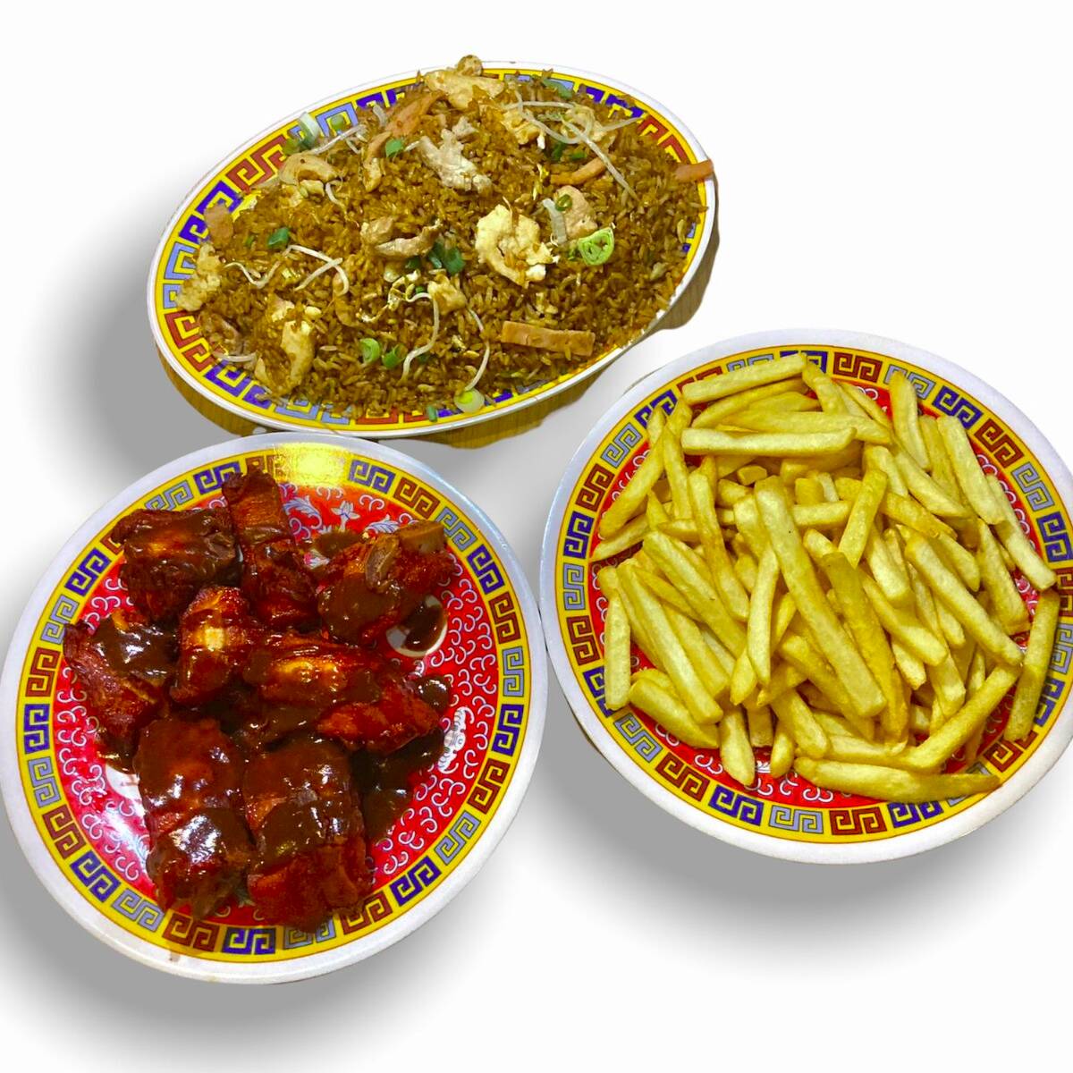Caja mediana de Arroz + Costillas a la BBQ (4) + Papitas a la francesas (Para 3 Personas)