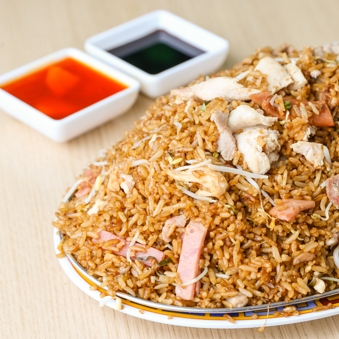 Arroz chino frito especial (Trae Pollo, cerdo, jamon, cebolla y raices chinas)