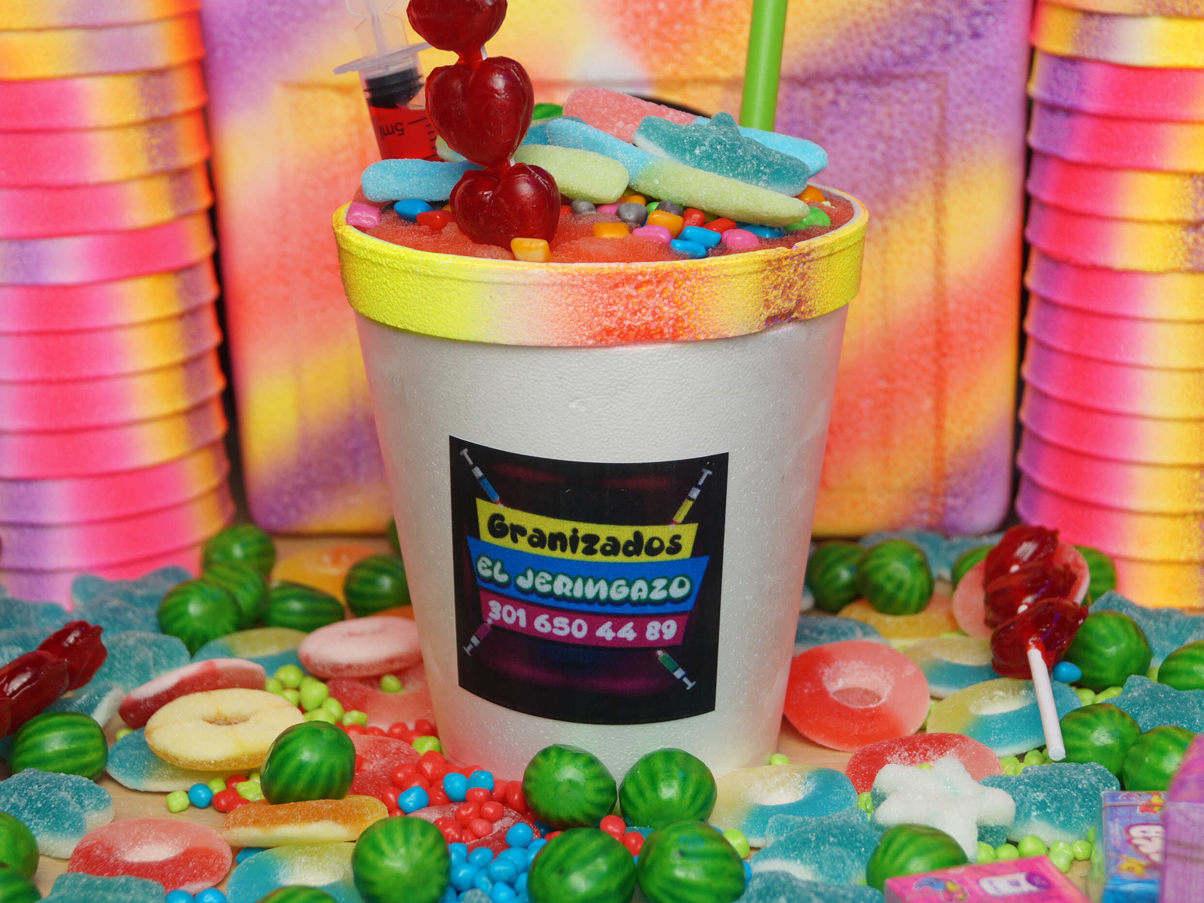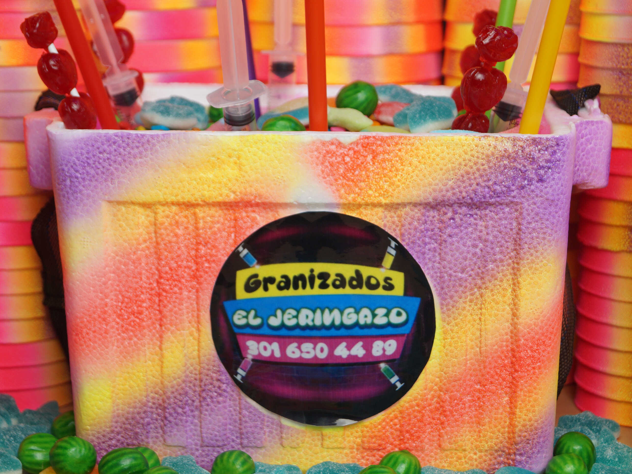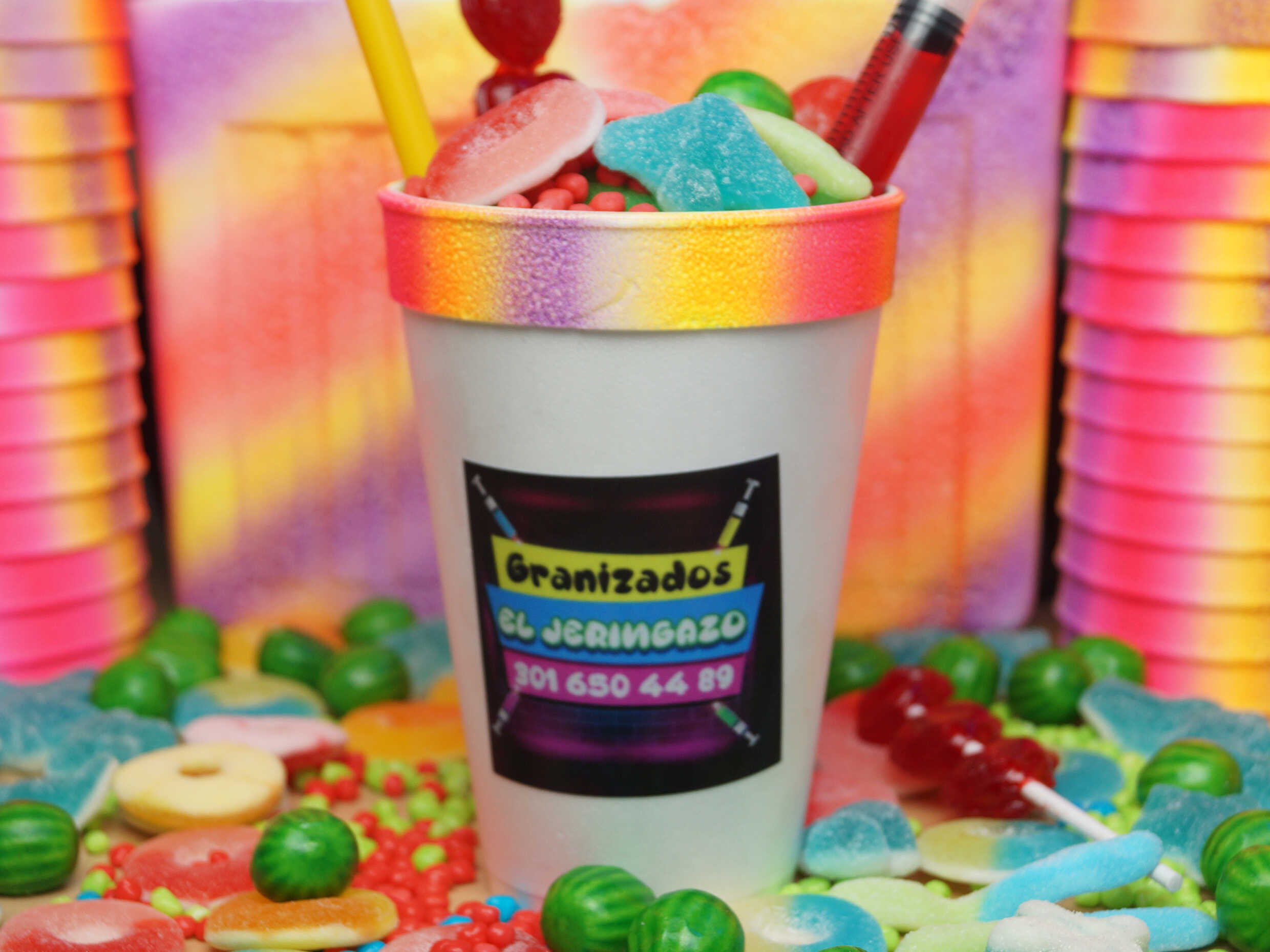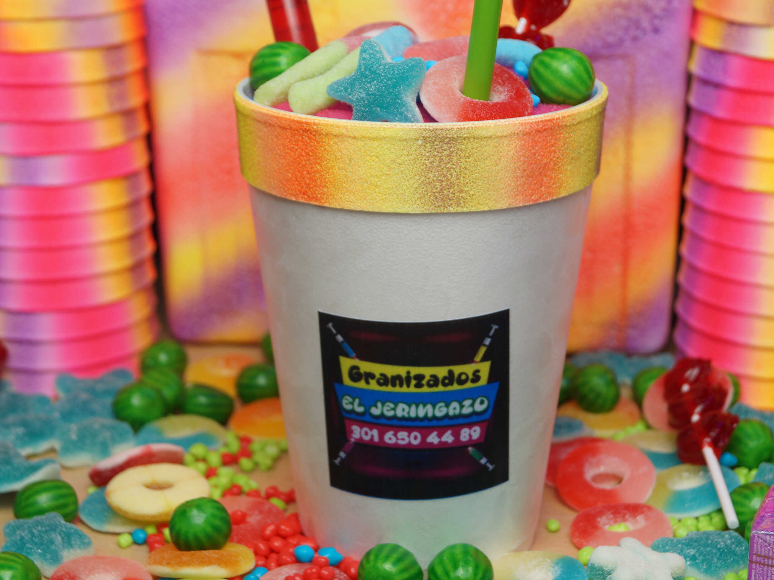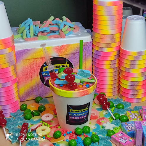 Granizado sabor a elegir: tussi, maracuya, bombombun, manzana verde, bubbalu, jagger,margarita, smirnoff, uva, lulo, beso negro (Incluye dulces).