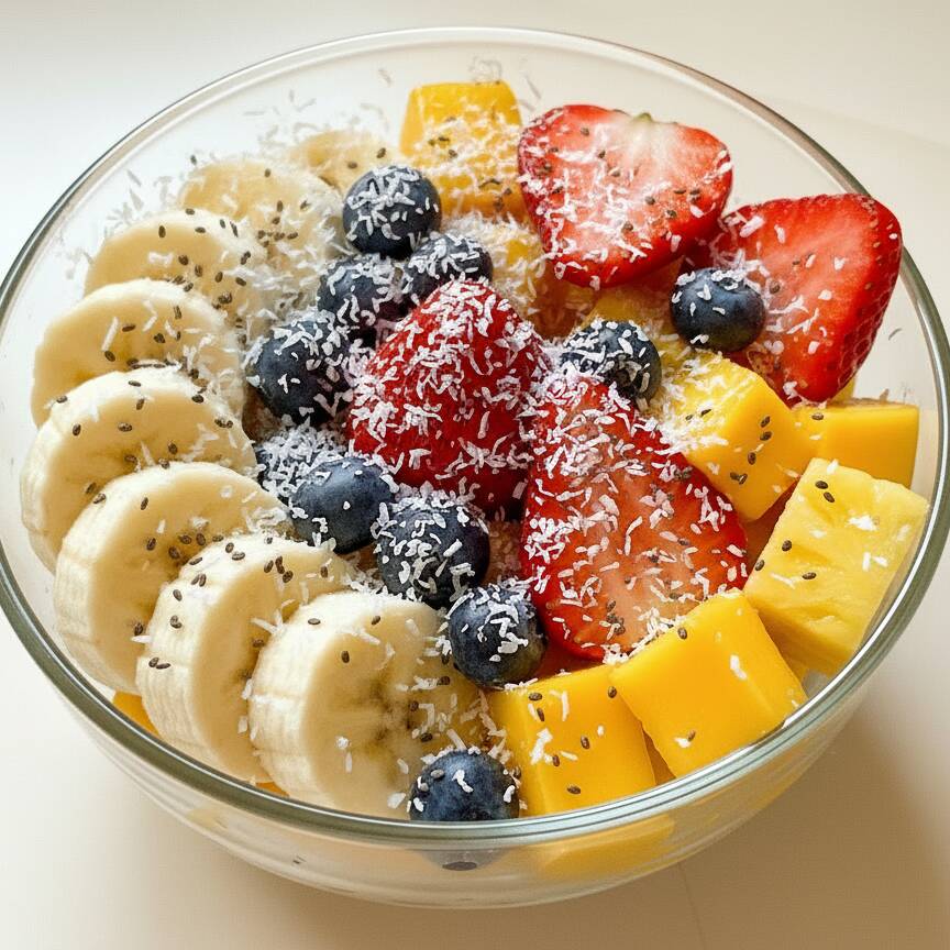 Rodajas jugosas de banano, fresas rojas vibrantes, arándanos azules intensos, cubos dorados de mango, coco deshidratado, semillas de chía y trozos brillantes de piña, todo apilado en un recipiente listo para ¡darte salud!