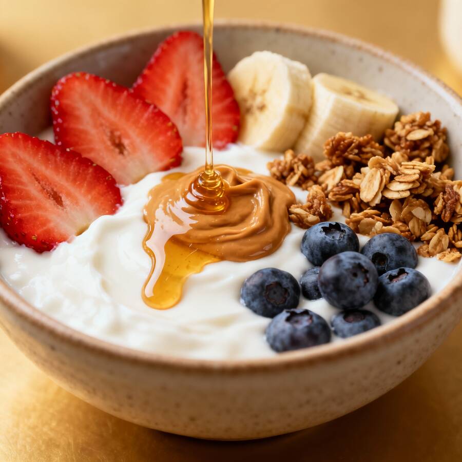 Base de yogurt griego, granola, mantequilla de maní, banano y fresa