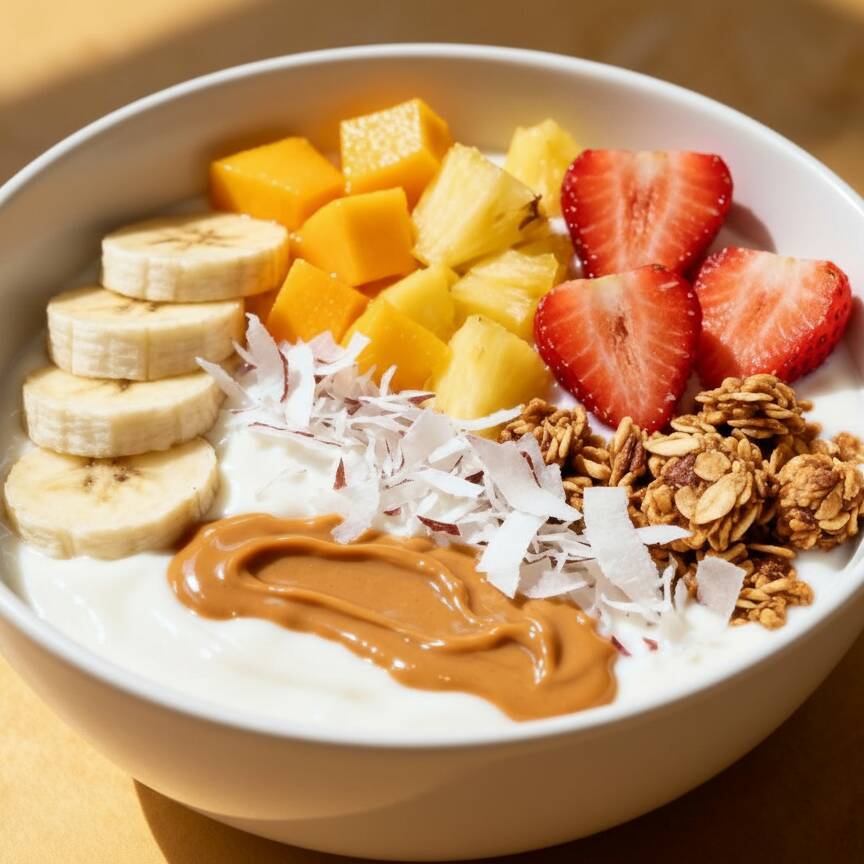 Base de yogurt griego acompañado de banano, mango, piña, fresa, coco deshidratado, granola y mantequilla de maní