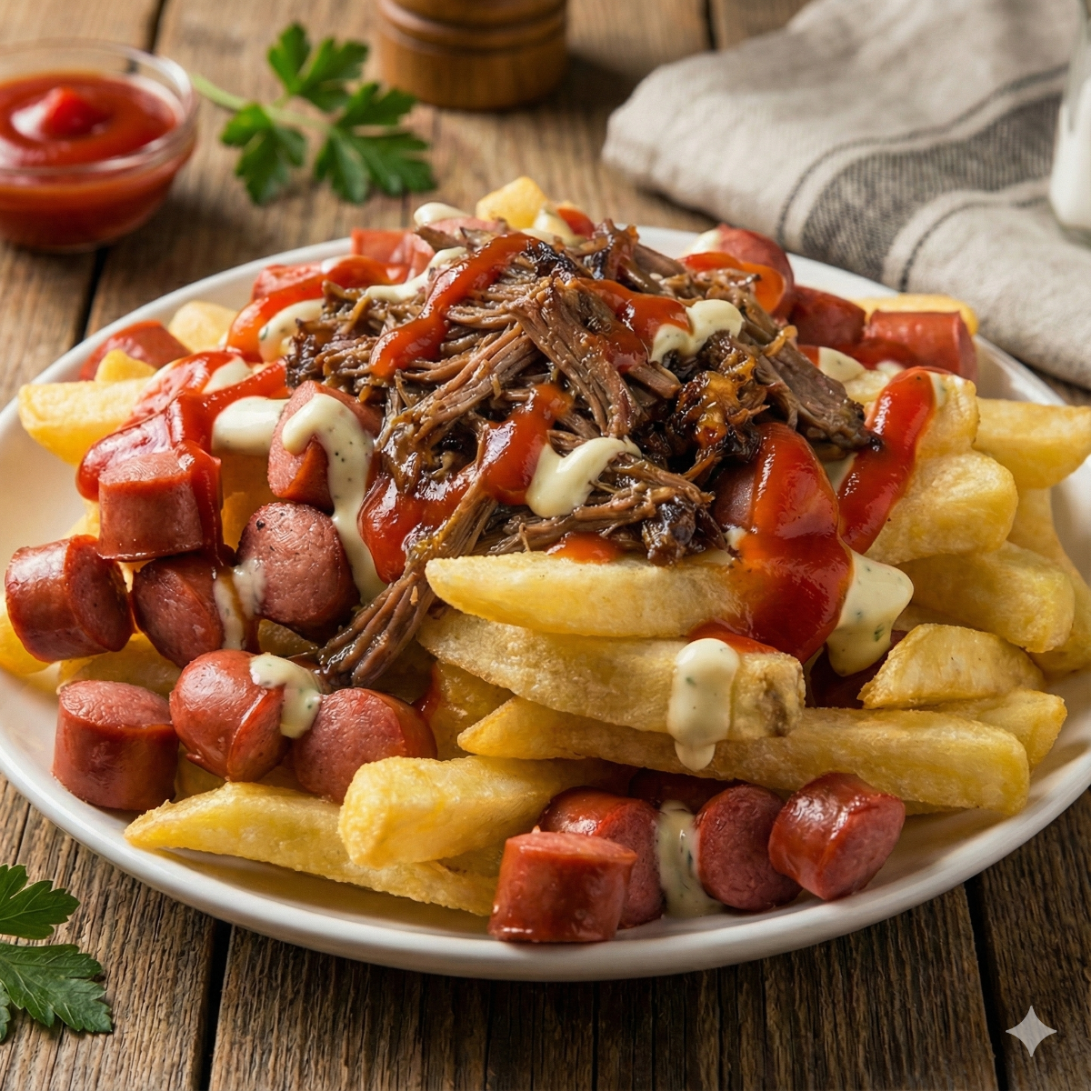 Papas a la francesa, salchicha tradicional, carne desmechada, queso mozzarela, 1 huevo de codorniz y salsas.