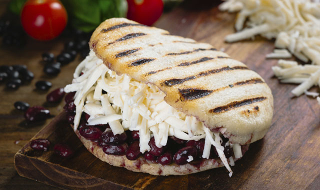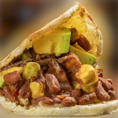 Arepa rellena con carne desmechada, caraotas, queso costeño rallado y maduro.