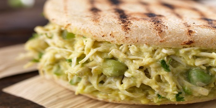 Arepa rellena con ensalada de pollo desmechado y aguacate.