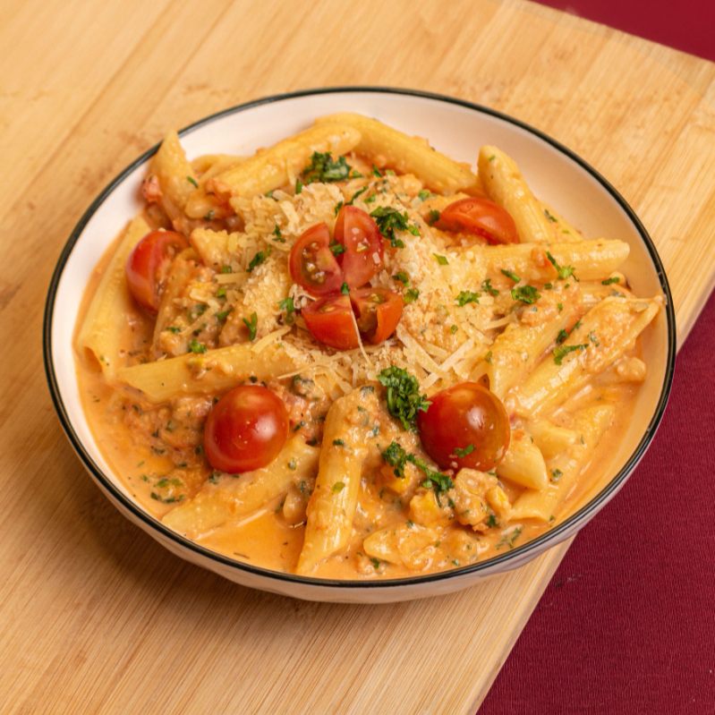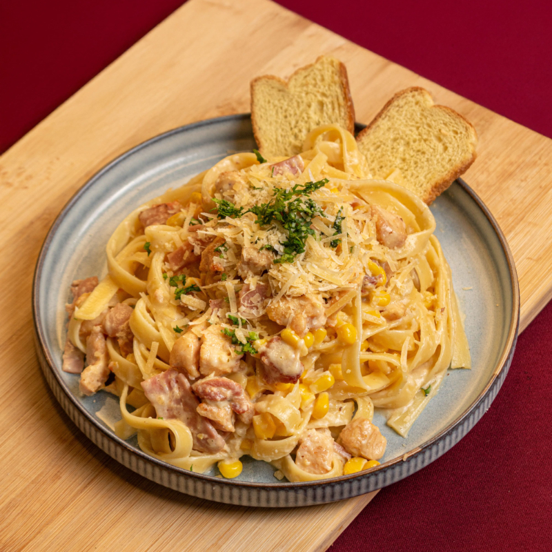 Pasta larga en salsa carbonara-alfredo, preparada con pollo, jamón, tocineta, maicitos y queso mozzarella. Lleva crema de leche, queso parmesano y un toque suave de especias que equilibra el sabor. Incluye tostadas.