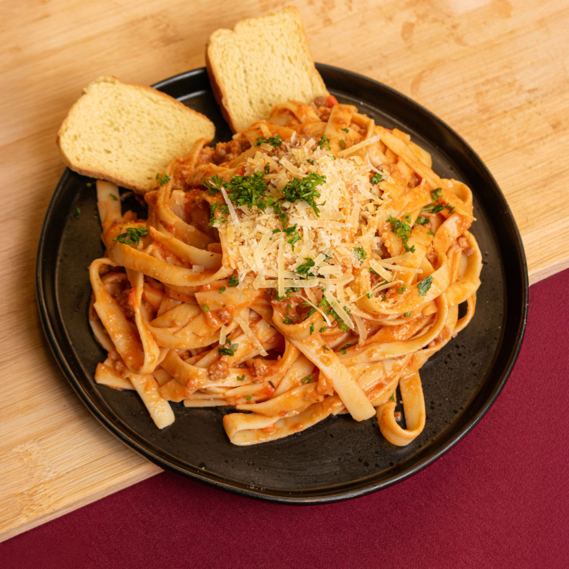 Pasta larga en salsa carbonara con tomate, carne molida y queso parmesano. Incluye tostadas y un toque muy leve de picante que no invade el sabor.